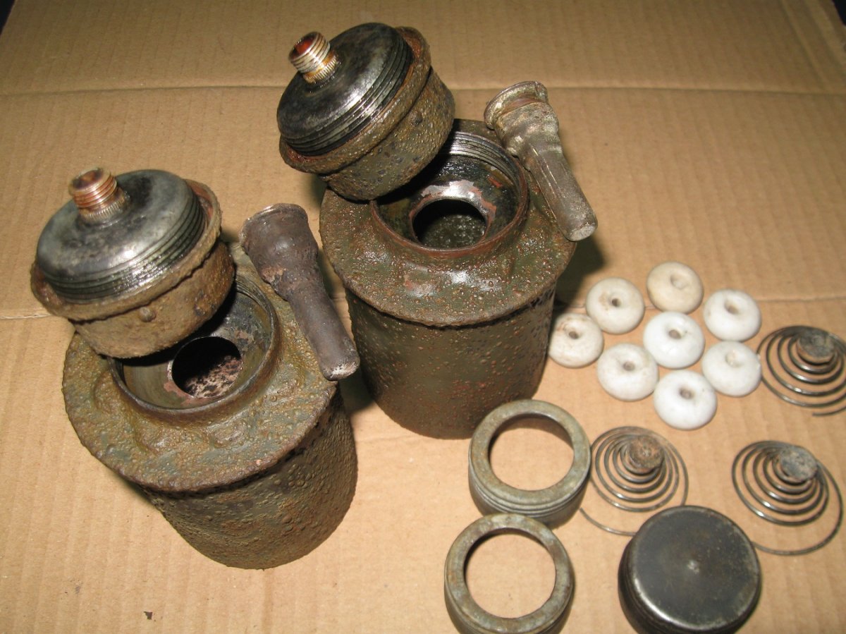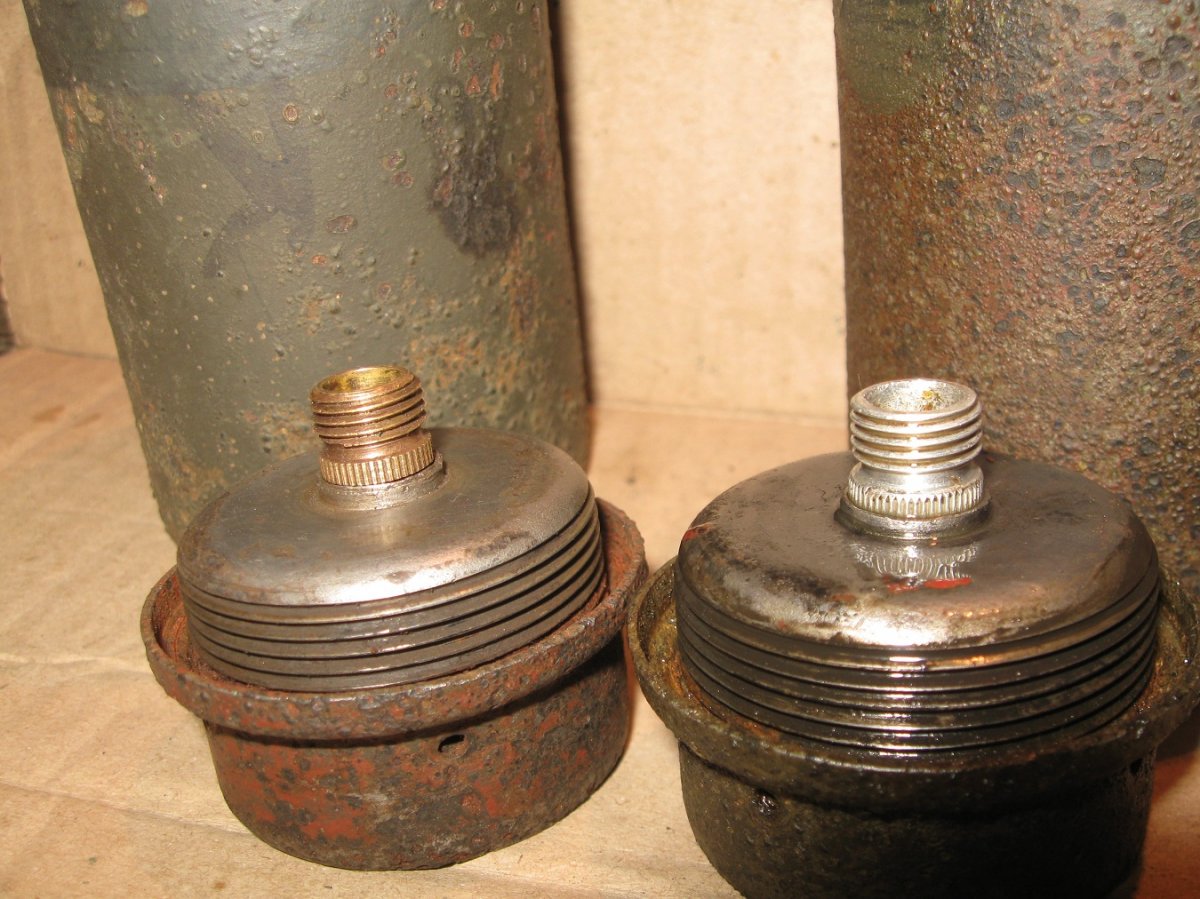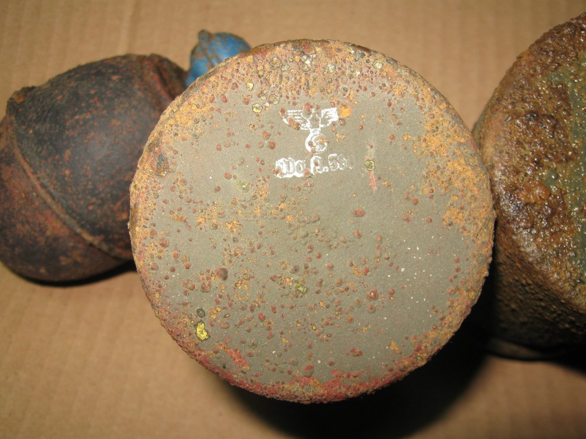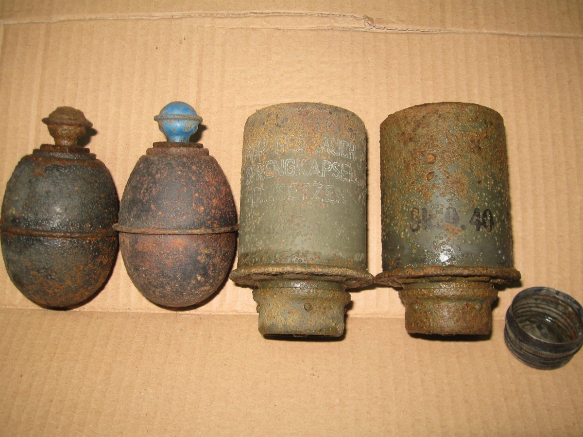 Всем привет! За день скитаний всякого попалось, фоток нету - не планировал делать отчёт. Короче, уже начало темнеть, думаю за тем выступом делаю поворот и к машине........... домой. Зацепил довольно не мелкий сигнал с глубины ( обожаю такие) на глубине по колено и в корнях , начал крошить лопатой консервные банки- это я так подумал, но шибко обломался, вся яма кишела яйцами М-39 уничтожил их с 10-ок там............. пока их таскал, думалось- хотьбы одну колотушку бросили гады, увы- не было. Собрался идти к машине- уже темно, в двух метрах от ямы сигнал под деревом!!! ковырнул, а там колотушки во блин- пришлось их ковырять в корнячче руками, лопатой и подлезть никак-было. Сохран колотух ни чё-так, бодрячковые! Яиц- дай бог штук 5-6 будет хороших, остача на запчасти.