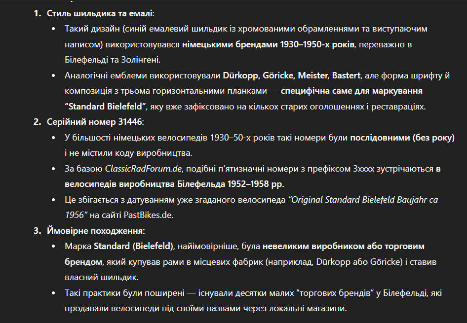 Вечір добрий. Що вдалось нарити: велосипеди «Standard» родом з Німеччини, а саме з міста Білефельд. Заключення від ШІ по шильдику і номеру рами: Тож можна припустити що велосипед випущено в період 1952–1958 рр. Ну і кому цікаво - під спойлером трохи про Білефельд і велосипеди. Спойлер Білефельд. Білефельд вийшов з кризи швейних машин наприкінці 19 століття як «місто велосипеда». Ціла галузь виникла завдяки тому, що підприємці Білефельда, такі як Ніколаус Дюркопп, розпізнали ознаки часу. Сьогодні від цього немає й сліду. Історик Себастьян Кнаке (30) проаналізував причини злету та падіння «білефельдського велосипеда» у своїй магістерській дисертації, і тепер його робота була відзначена нагородою. «Пан Кнаке успішно створив інноваційну роботу на важливому етапі економічної історії Білефельда», – високо оцінив Йоганнес Альтенберенд, голова Історичного товариства графства Равенсберг. У суботу товариство нагородило Кнаке премією Густава Енгеля за його видатний економіко-історичний аналіз (під назвою «Велосипедний кластер Білефельда – виникнення, розвиток та занепад регіональної інтегрованої економіки»). Уродженець Білефельда, який зараз завершує навчання в докторантурі, має намір використати призові 2000 євро переважно на новий робочий пристрій (ноутбук для архіву) та книги. «Гарний історик інвестує переважно в книги», – каже 30-річний історик зі сміхом. Мабуть, йому довелося переглянути безліч книг і файлів, перш ніж 30-річний чоловік зміг отримати такий вичерпний огляд велосипедної промисловості Білефельда. Він хотів зобразити історію, в якій «не обов'язково є сяючий переможець». «Тут ціла галузь повністю зникла. Я хотів пояснити, що насправді сталося». За словами університетського рецензента Альтенберенда та Кнаке, професора Вернера Абельсхаузера, цього було досягнуто переконливо. Перед аудиторією близько 150 осіб у Великій залі Нової ратуші молодий історик переконливо пояснив феномен «білефельдського велосипеда»: «Коли велосипед з’явився як засіб пересування, білефельдські підприємці вирішили відмовитися від масового виробництва. Білефельдським рішенням став цільний велосипед». Вони зосередилися на якості, яку виробники швейних машин ще більше підкріпили своєю доброю репутацією в маркетингових цілях, пояснив лауреат премії. На заводах було потрібне обладнання та кваліфіковані працівники. Все більше й більше з них оселялися в Білефельді. Місцеві постачальники виробляли гнучко та відповідно до високих стандартів виробників велосипедів Білефельда. «Велосипед Білефельда» став успішним продуктом. Майже всі деталі вироблялися тут – виникла мережева економіка. Кнаке називає це «кластером», який не міг існувати паралельно в Гютерсло, наприклад: «Коли Miele хотіла увійти у велосипедний бізнес, кваліфіковані робітники відмовилися їхати до Гютерсло. Тож велосипеди Miele також вироблялися в Білефельді». Але з економічним бумом 1950-х і 60-х років автомобіль витіснив велосипед. Велосипедна індустрія була змушена приєднатися до фітнес-хвилі або створювати постійно нові тренди, такі як складні та розкладні велосипеди. «Вертикальна інтеграція велосипедів Білефельда не забезпечувала такої гнучкості. Перевага часу стала недоліком», — каже Кнейк. Численні компанії з Білефельда припинили виробництво велосипедів (Anker у 1954 році, Wittler and Dü