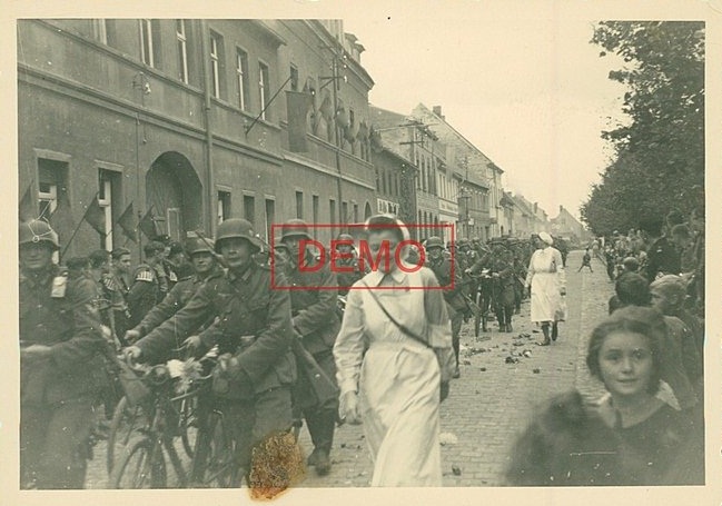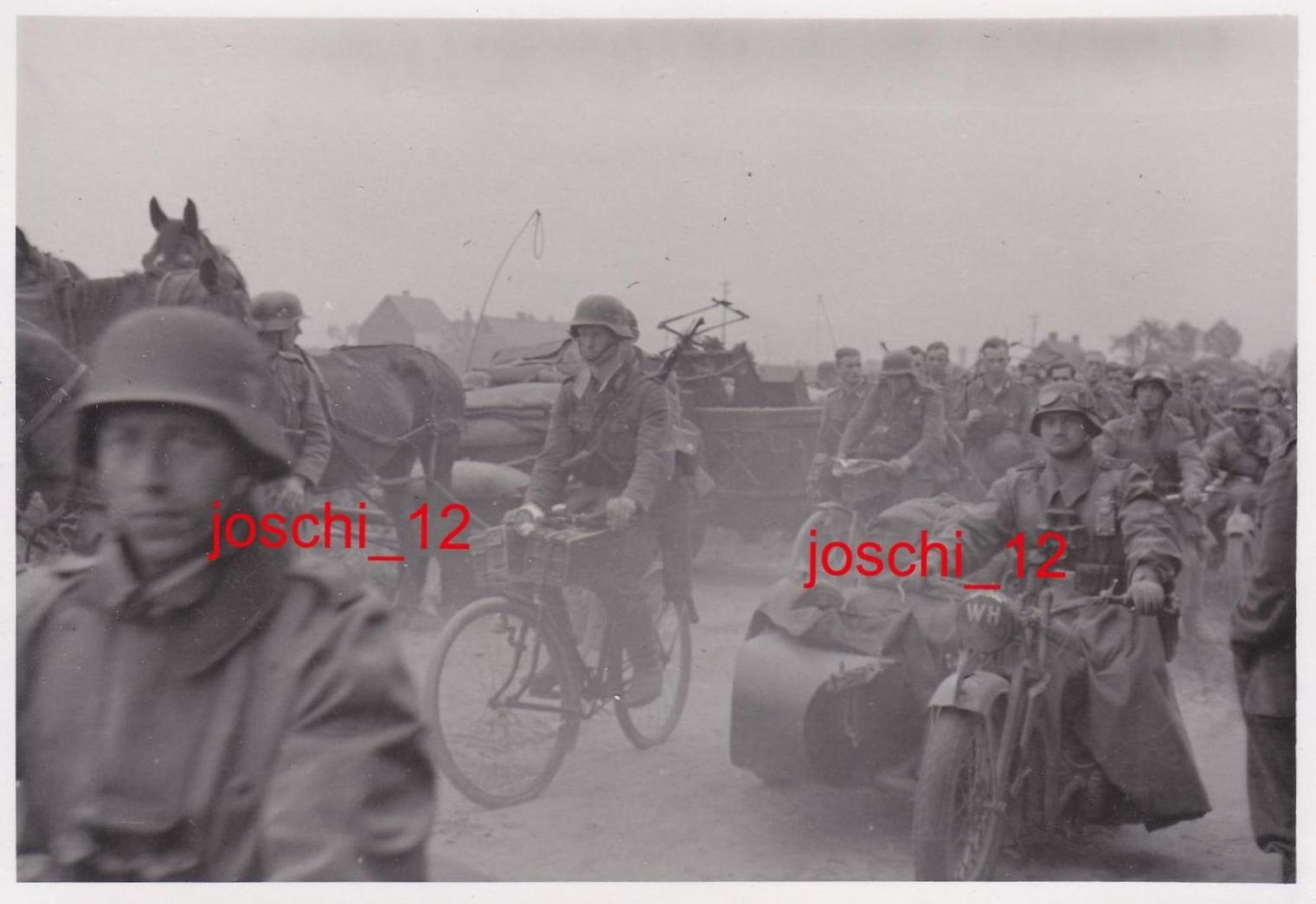 "На втором плане - красота и гордость германской армии, надежда Гитлера и основная ударная сила блицкрига - германские велосипедисты ..."