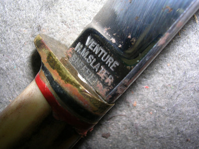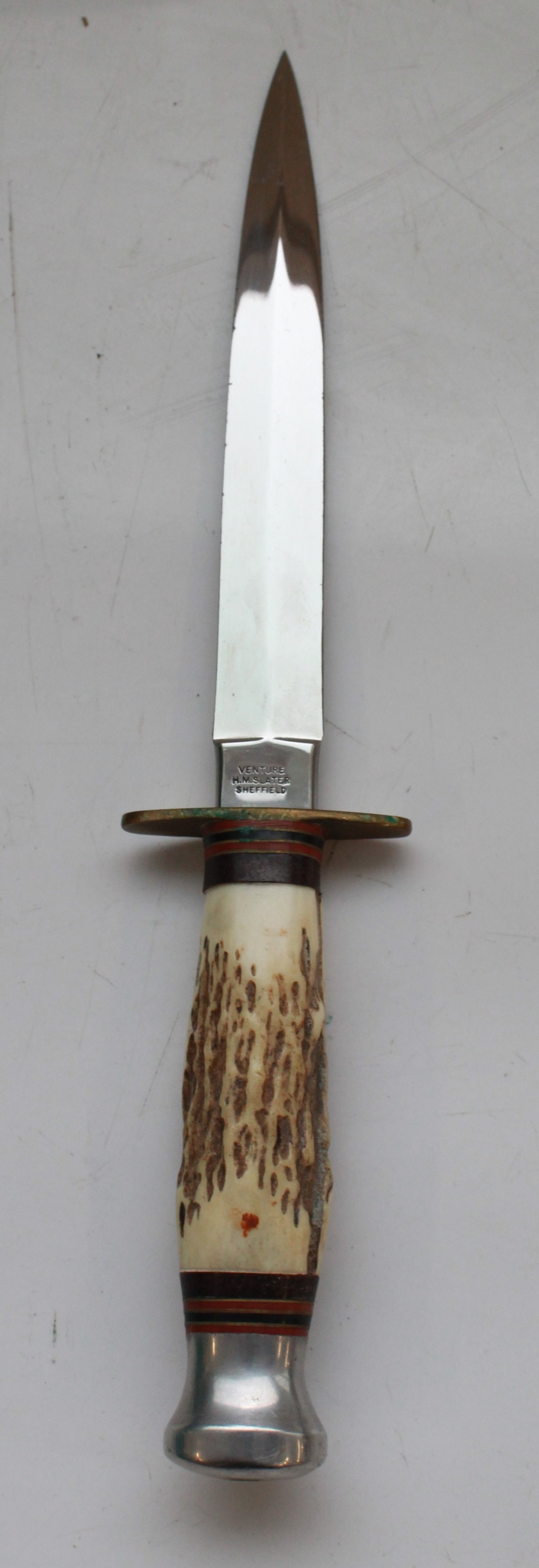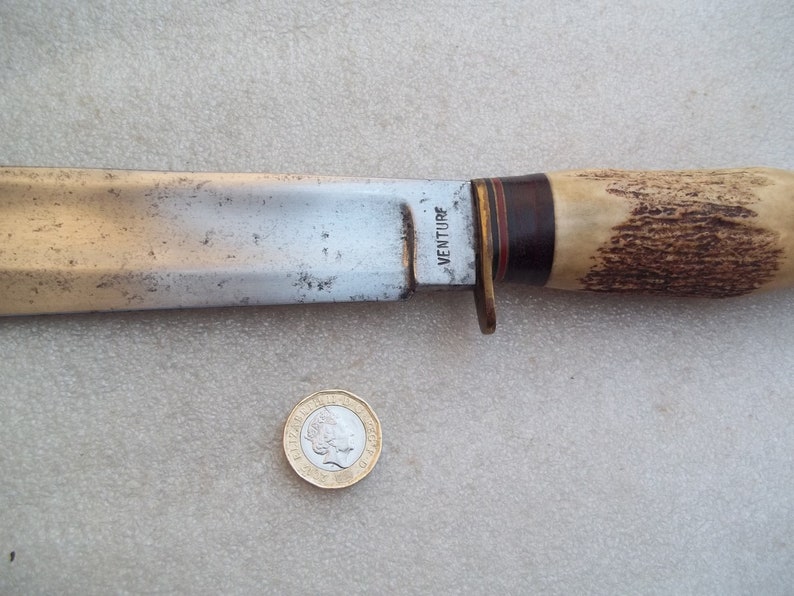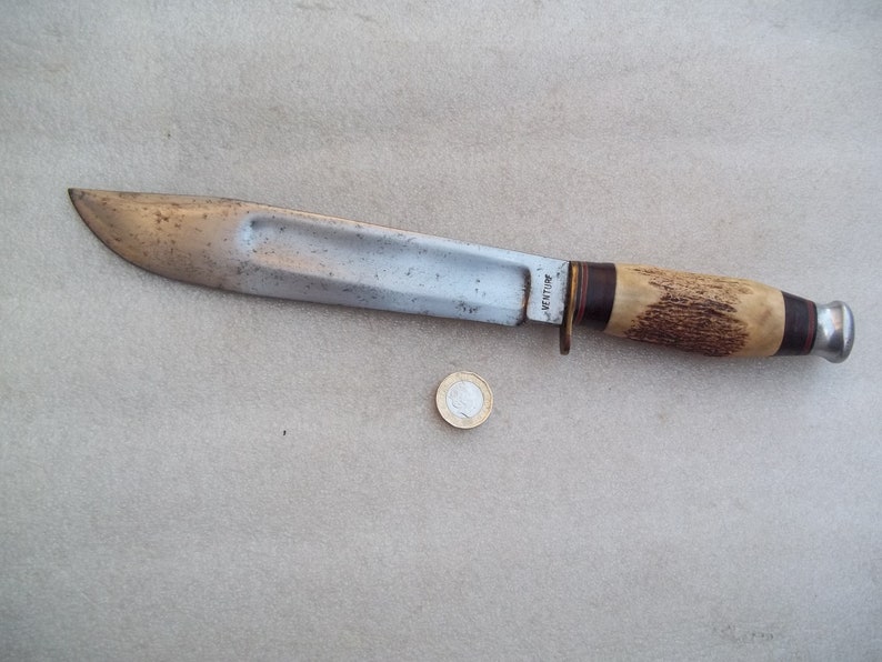 Не сказав би, що предмет нечастий. Але фірма з гарною історією, бренд Venture використовувався за угодою із Thomas Glossop & Sons. Фірма виробляла до кінця 80-х, на початку 90-х бізнес продали. Зараз під цією маркою у Шеффілді магазин посуду. Ось приблизно такий як Ваш https://www.etsy.com/ca/listing/1391008947/vintage-venture-bowie-knife?ref=elp_anchor_listing&sts=1 Загалом, на поціновувача, на Заході їх називають узагальненою назвою Bowie knives, десь з 50-х мода на них пішла, разом із фільмами - вестернами.