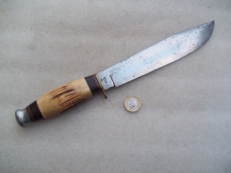 Всем здравия! Подскажите пожалуйста по ножу: примерно каких годов, охотничий или сувенир? Толщина 4,5. Нож пользован,но без фанатизма. По запросу "нож канадского типа" выдаёт другие варианты. Пытался искать по фото - подобные есть только американские. Заранее благодарю за ответ. С уважением!