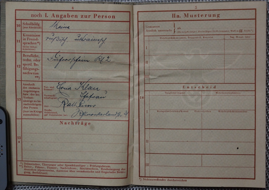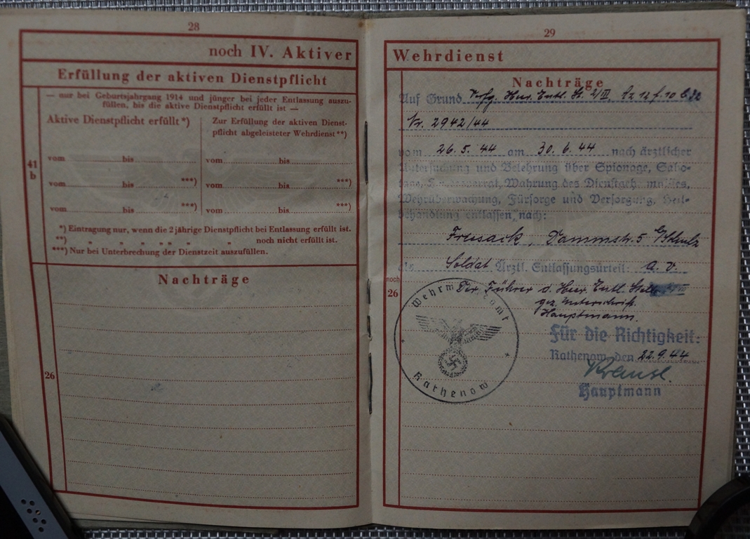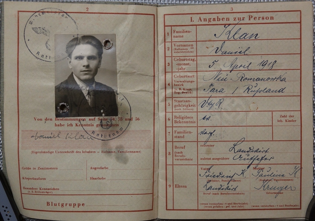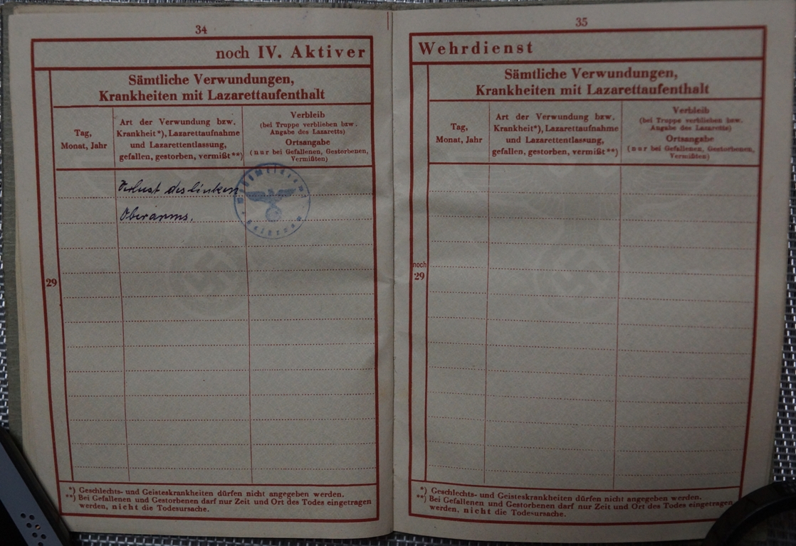 Здравствуйте. Ответили.Очень благодарен It is about a document of replacement, Zweitschrift, established further to the loss of the oreginal document. This Wehrpass was established on September 21st, 1944 (page 1) to Neuruppin (locality situated in the Land Brandenburg) this after the end of the service, on June 30th, 1944 (page 29) of the serviceman holder of the document further to a grave wound (loss of the left arm) (page 34). The page 12 which shows normally the units of fight mentions only the unit of dismissal (identical to the page 47), Heeres Entlassungstelle 2 / III. The page 24 shows the decorations received by this serviceman : 21.08.1943 badge of the wounded persons silver (this further to the loss of its left arm), in 25.11.1942 Ostmedaille, in 22.03.1943 Panzerkampfabzeichen Silber (this decoration indicates that this serviceman was a member of a unit of armored cars). Interesting detail for you on the page 3, the holder of the document, Daniel KLAN, was born to Neu Romanowka, sector of Tara in Russia. I found a locality of Tara on the Internet, it is situated in your sector, Oblast Omsk !