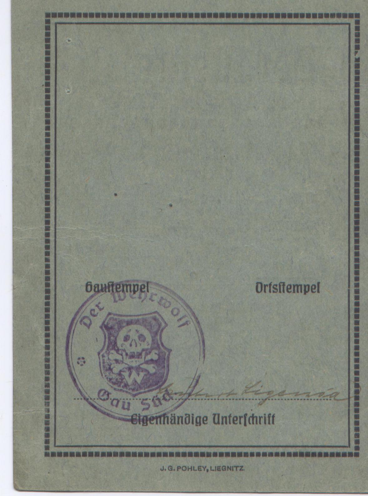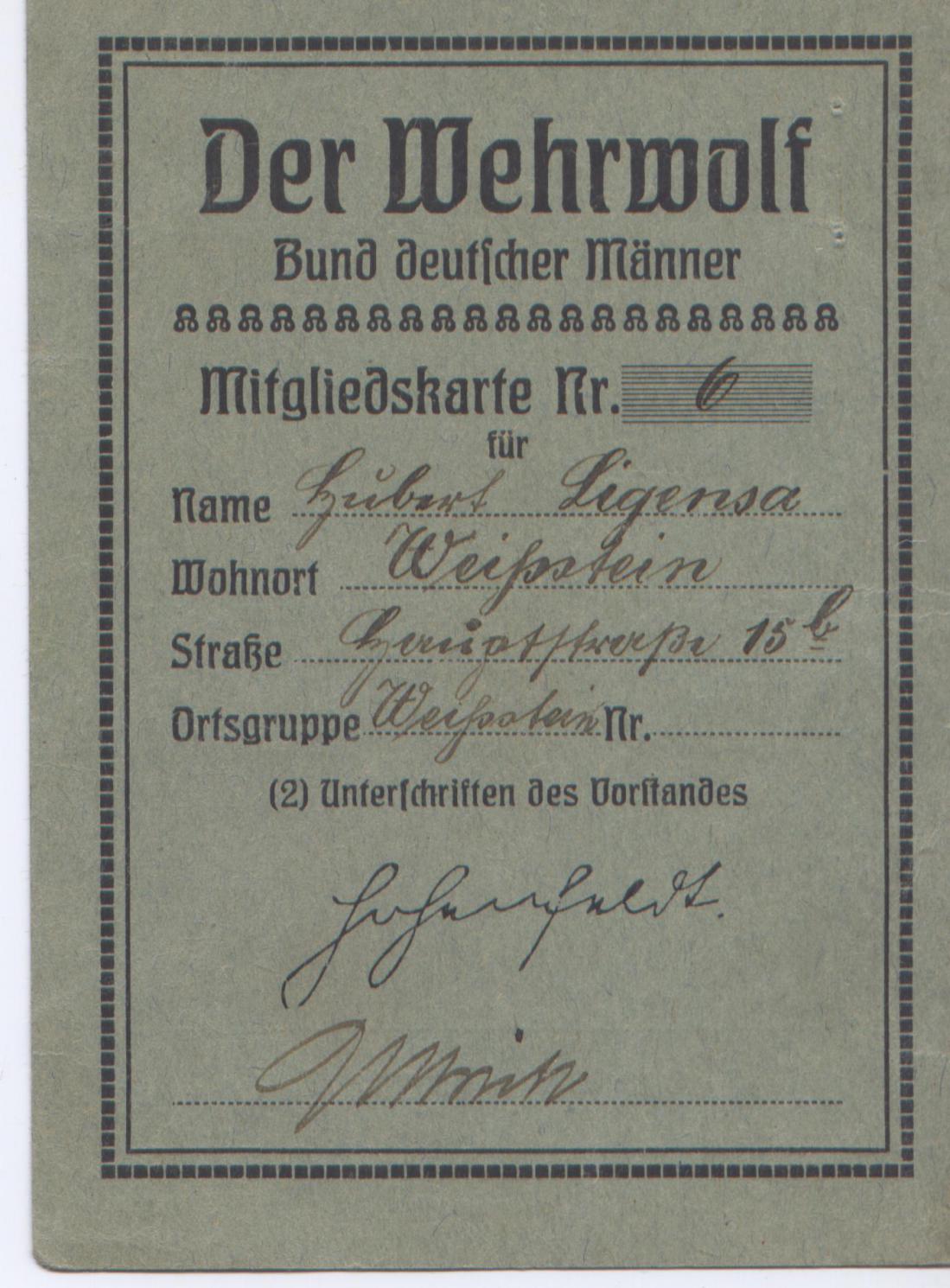 Это карточка члена «Общества немецких мужчин», ничего общего со ставкой не имеет. В Германии была популярна книга Герман Лёнса «Вервольф», и это название книги могло и послужить кодовым словом для ставки под Винницей.
