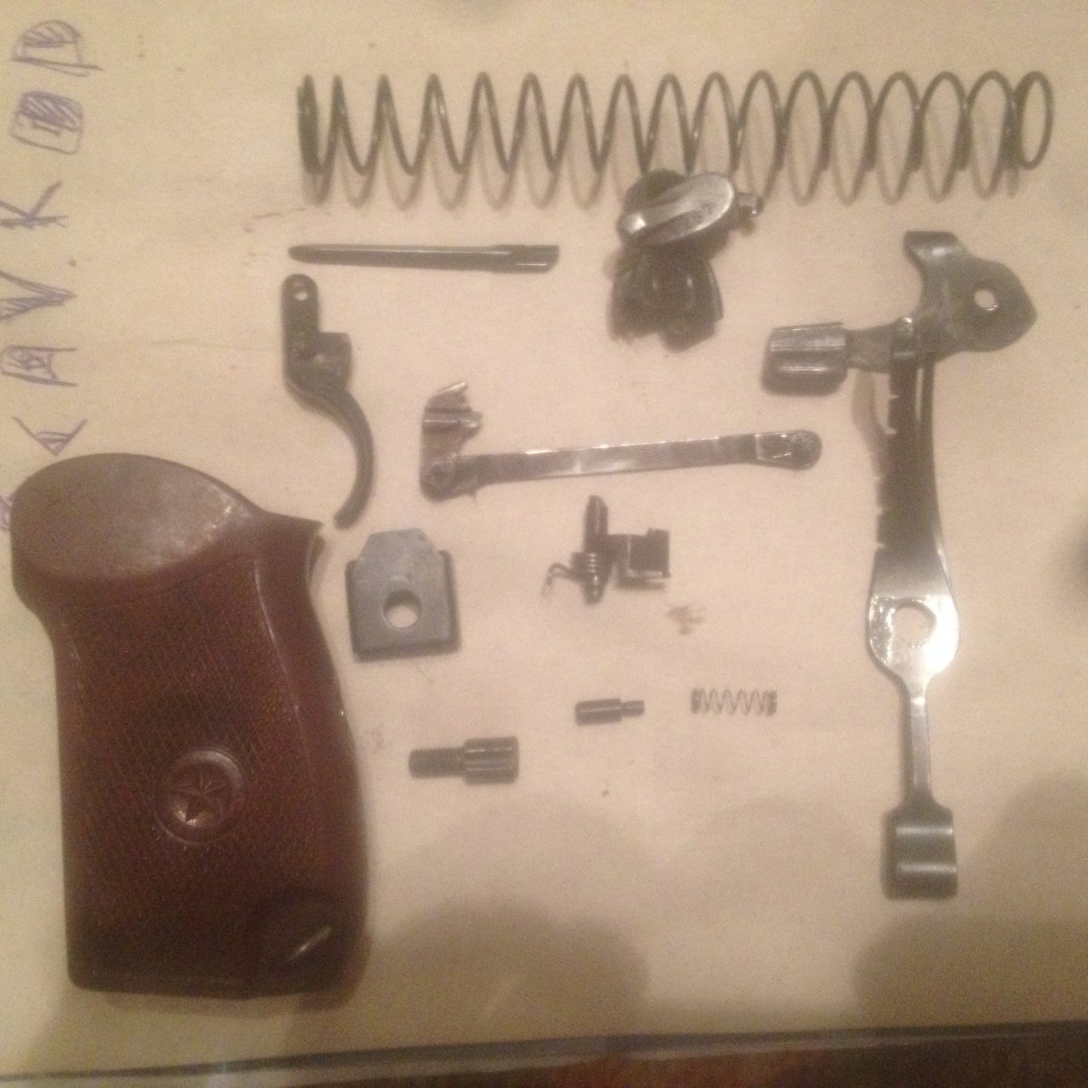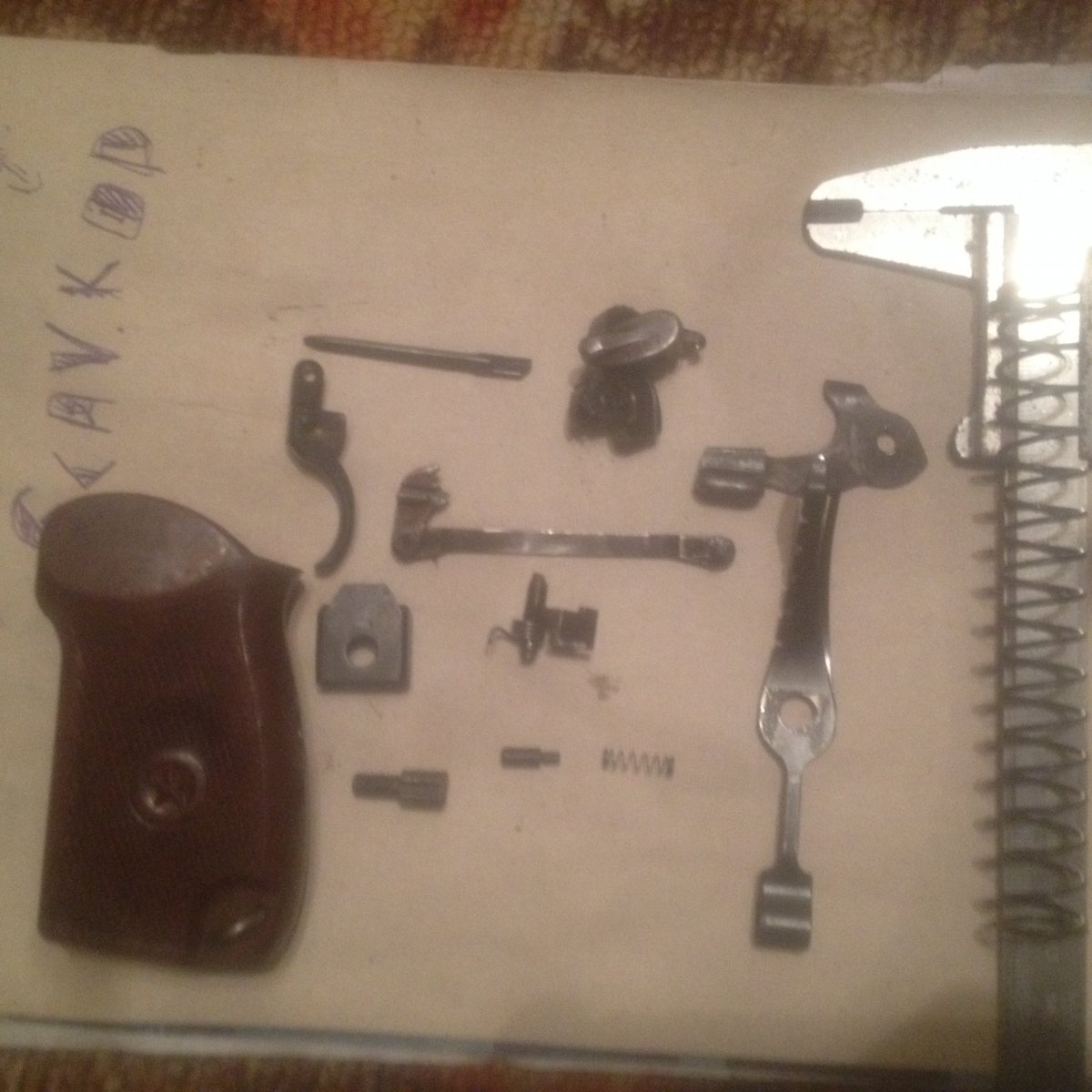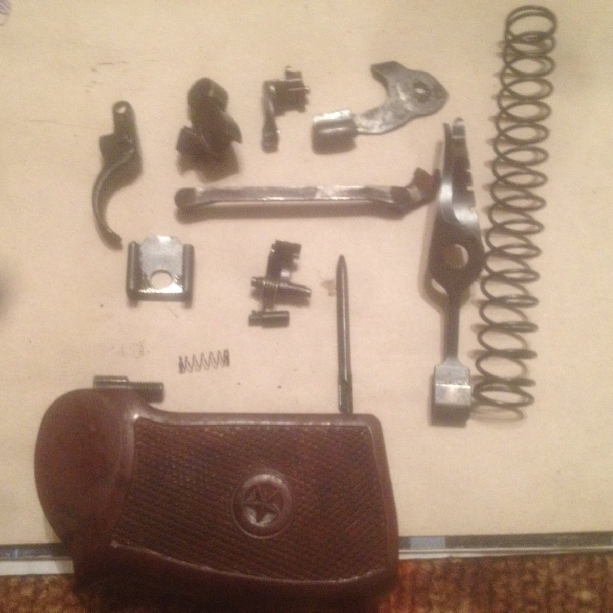 Возвратная пружина Боёк Курок(чёрный) Спусковой крючёк (нового образца?) Предохранитель красный номерной ЗЗ "дутая" Тяга спуска красная Шептало красное Фиксатор боевой пружины Боевая пружина Гнеток +пружина Рукоять бакелит без сколов и царапин