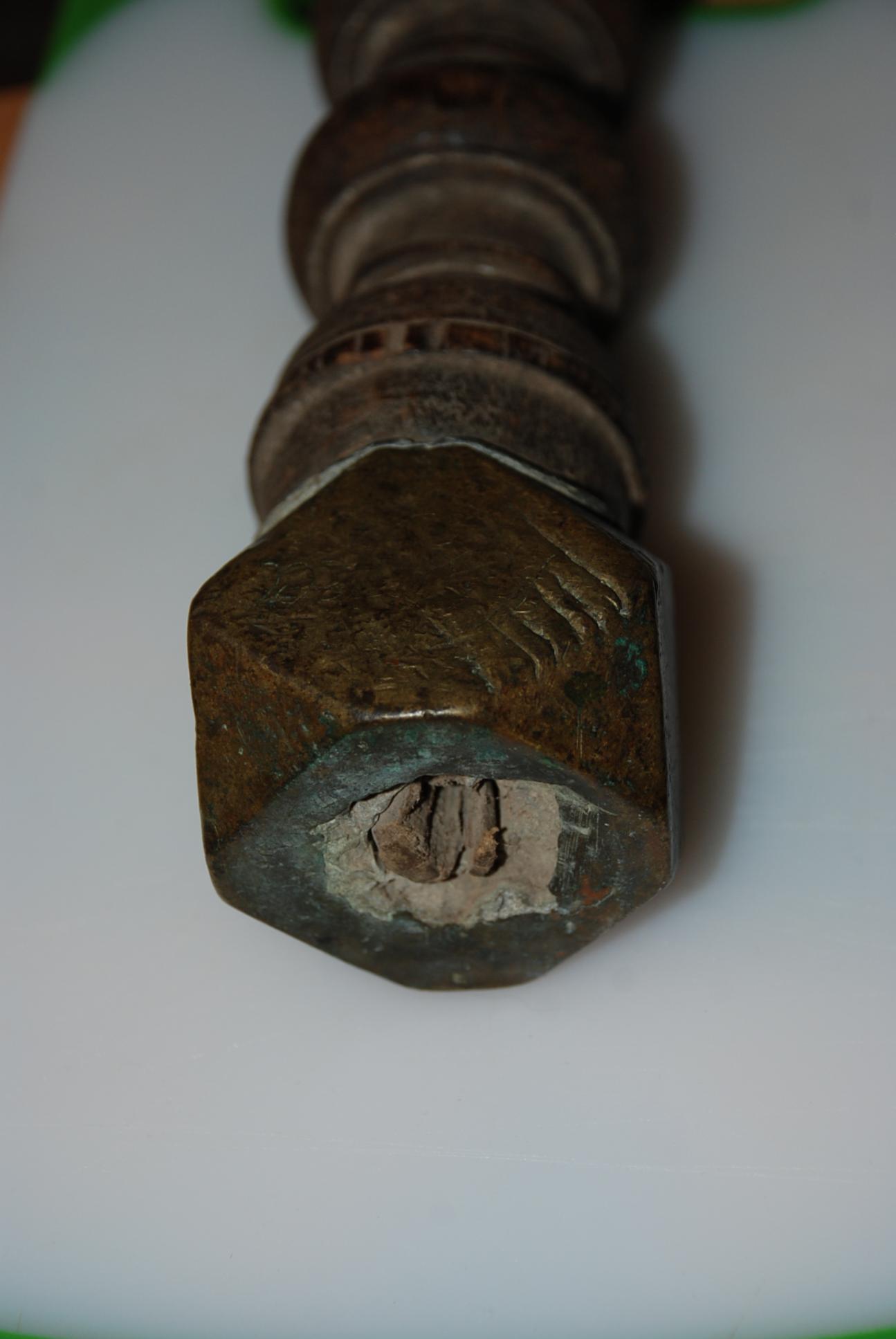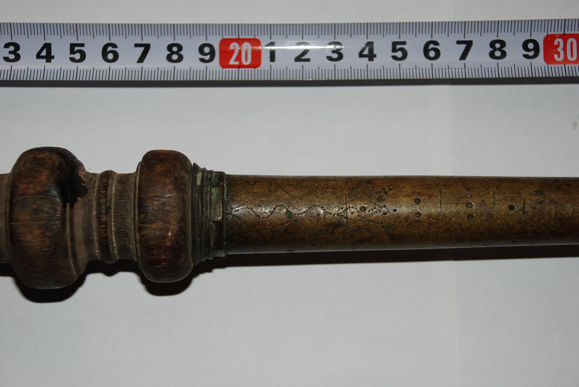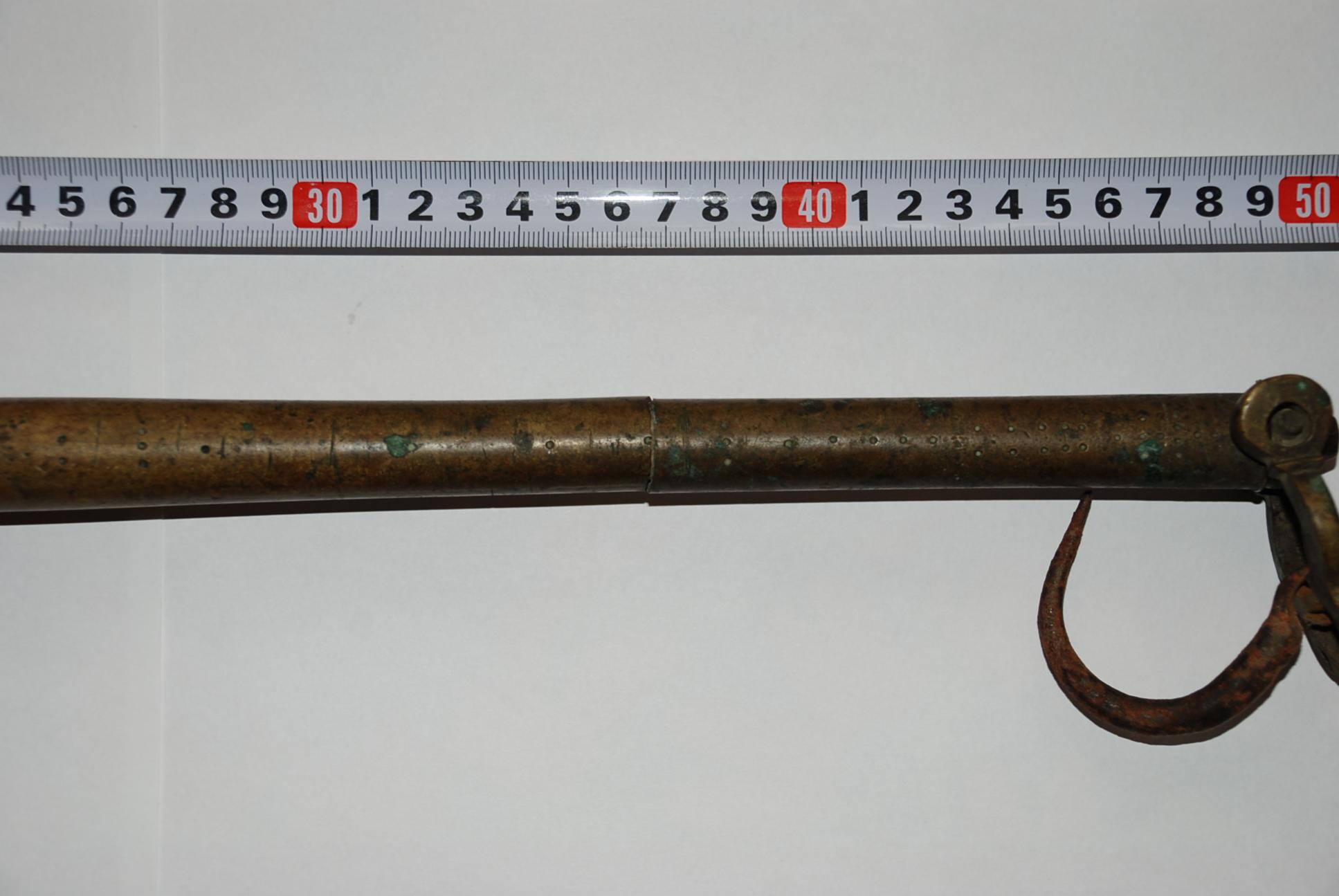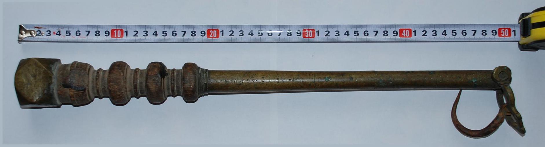 Все на месте, не хватает петли, за которую держали безмен, а одевалась она последовательно на более тонкие места между шайбообразными утолщениями до установления равновесия в горизонтальном положении.Там есть точечные отметки с мерами веса.