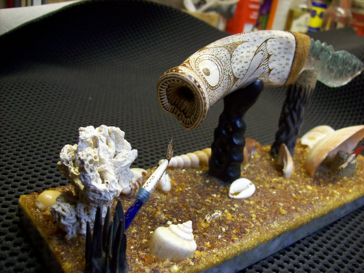 Шо , полуночники ... не спится ? Осьо закончил заказ ... все кишки вымотал ... основа - полированный кальцит , подставки под ножи - эбонит , ракушняк натуральный , "дно" - крошка натурального янтаря .. большой : рукоять - рог оленя с пирографией , обвязка замша , хрустальное стекло ... маленькие : рукояти из рога лося , тоже с немного пирографией , кобальтовое стекло и селеновый рубин ... типа сценка - Морской Охотник