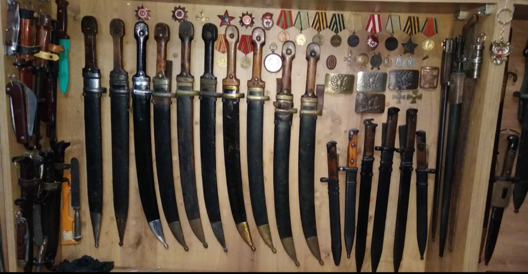 Чувак лет 25 назад все продал, а потом снова начал собирать, там ещё вся стена в файтингах, кортиках и на горячее тоже есть... :D