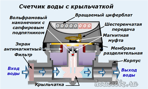 В самой крыльчатке стоит небольшой штифтик...магнитный...Циферный механизм срабатывает от оборотов крыльчатки, которая герметично находится в потоке воды......