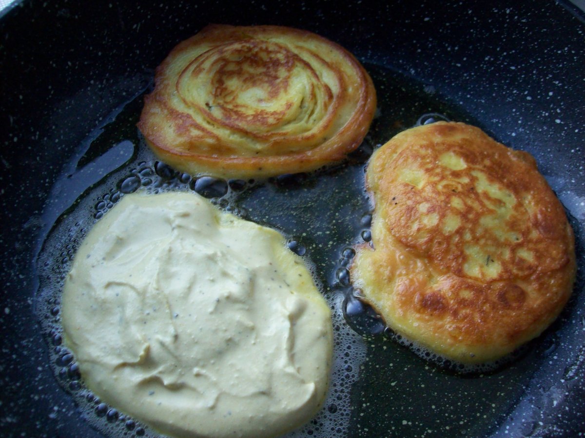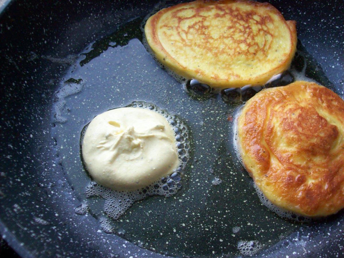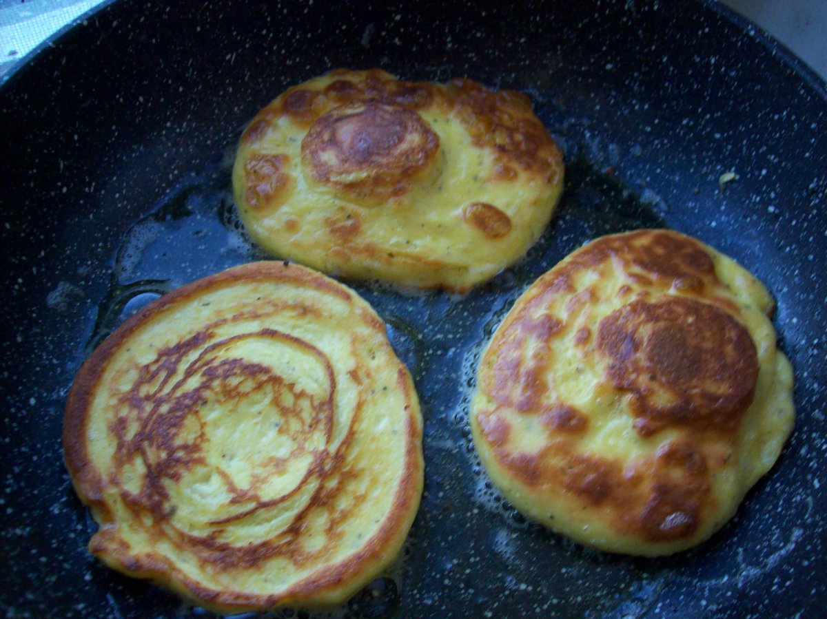 В обчем , сегодня , в кои то веки , у мну получилось интересное из неопределённого ... Есть устоявшиеся рецепты , а есть эксперименты - ну то есть берёшь то что осталось в холодильнике/по сусекам , соединяешь иии... бимба ... у меня , ещё буквально 5-6 лет назад , любой эксперимент заканчивался хвалебными дифирамбами от вкушающих ... потом , как то постепенно , сошло на самый никакой уровень - не . всё вкусно ... но нет прикола .. И вот сегодня я немного отыгрался ... Учитывая мои переломы рёбер, я попытался налечь на творог с рыбьим жиром разливным (витамин D) /сметаной , куркумой /орехами ... кстати - писец какая действенная штука оказывается ... но больше 250-300 грамм творога в сутки в мну не лезло ... И вот есть подгулявший ( трое суток ) творог , пару сарделек ( нормальных - по 150 грн/кг + 50% скидка - опять порадовало Сильпо ) и ... желание поизвращаться ... По итогу : в блендере взбил полкило творога , два яйца , приправы , соль , мука (чуть меньше стакана ) и оставил на пару часов в холодильнике .. Порезал сардельку на 15 ломтиков ... и , в который раз кайфуя от нормальной сковородки , замутил вот такое : выкладываем полную с горкой ложку "теста" на сковороду ( это первые фотки ) , потом вкладываем и погружаем ломтик сардельки ... потом сверху кладём треть ложки "теста" и закрываем типа мнясо ... Жарим на среднем ( даже чуть ниже ) огне и помним , что творог очень быстро пригорает ... Я переворачивал каждый ... ну типа сырник , по два раза с каждой стороны ... Получилась настолько интересная шняга , что я даже не ожидал ... По вкусу , что то среднее между сардельки в омлете , но с очень интересным вкусом творога с травами ... В общем , приступаю к чревоугодию ... и напоминаю , что кроме банальных сырников , можно попробовать очень интересные вкусности ... получилось ровно 15 "сырников" ... .