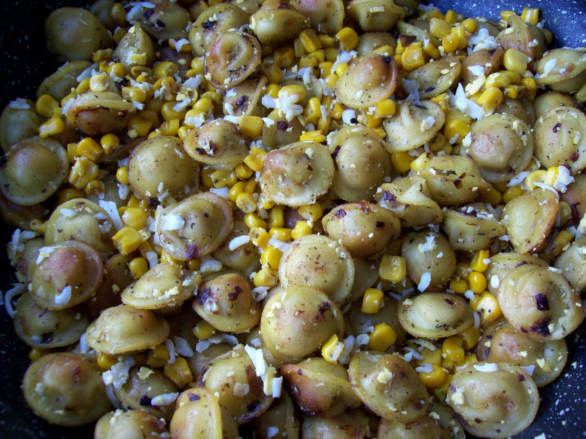 В обчем , так ... дано : 350 грамм мелких пельменят , банка консервированной кукурузы , лук репчатый , прованские травы , одно варенное яйцо , чеснок и подсолнечное масло ... в общем , то шо наскрёб по сусекам ;)