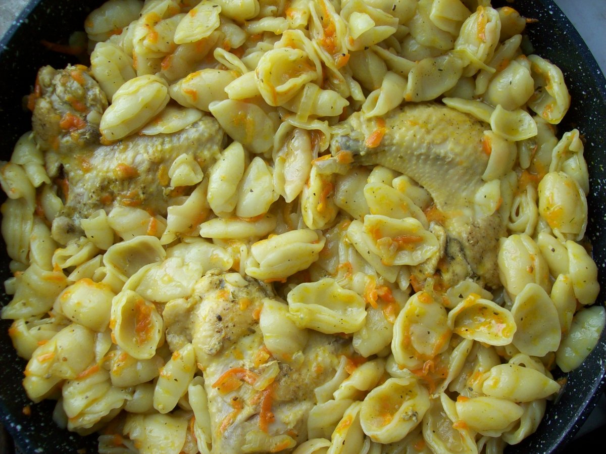 Щаз буду хомячить жалкое подобие конкилье с курицей ...это вид пасты , если шо , по нашему - ракушки ... приправки , лучок , морковь ... и секретный ингредиент :) ...