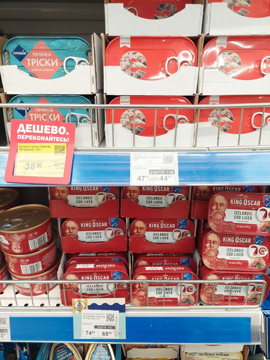 Печінка тріски (на фото) по 38.90(49.59)грн. Премія і 47.10грн. Екстра це та сама печінка по 74.40грн. Кінг Оскар;)