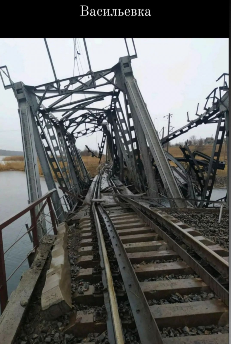 Осё фотка взорванного ж/д моста в г. Васильевка - это наши перекрывают пути свинопсам .