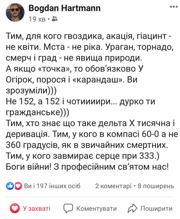 Побажаю точно в ціль, та хай вас уламки оминають ))