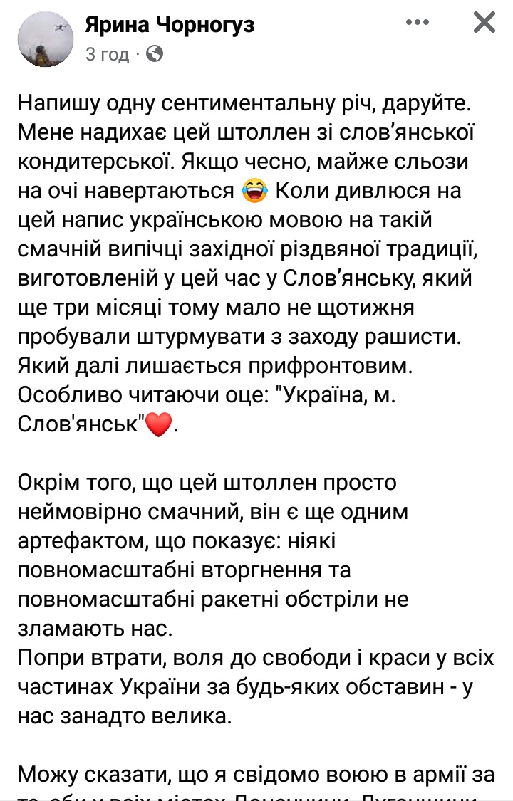 Напишу одну сентиментальну річ, даруйте. Мене надихає цей штоллен зі слов’янської кондитерської. Якщо чесно, майже сльози на очі навертаються Коли дивлюся на цей напис українською мовою на такій смачній випічці західної різдвяної традиції, виготовленій у цей час у Слов’янську, який ще три місяці тому мало не щотижня пробували штурмувати з заходу рашисти. Який далі лишається прифронтовим. Особливо читаючи оце: "Україна, м. Слов'янськ"❤️. Окрім того, що цей штоллен просто неймовірно смачний, він є ще одним артефактом, що показує: ніякі повномасштабні вторгнення та повномасштабні ракетні обстріли не зламають нас. Попри втрати, воля до свободи і краси у всіх частинах України за будь-яких обставин - у нас занадто велика. Можу сказати, що я свідомо воюю в армії за те, аби у всіх містах Донеччини, Луганщини, Харківщини, Київщини, Херсонщини, Запоріжжя, Житомирщини, Чернігівщини і Сумщини після жахів окупації, через які вони пройшли, зрештою виготовлялися на Різдво та Новий рік отакі якісні штоллени та всі місцеві люди мали змогу купити їх для своєї сім'ї. (с)