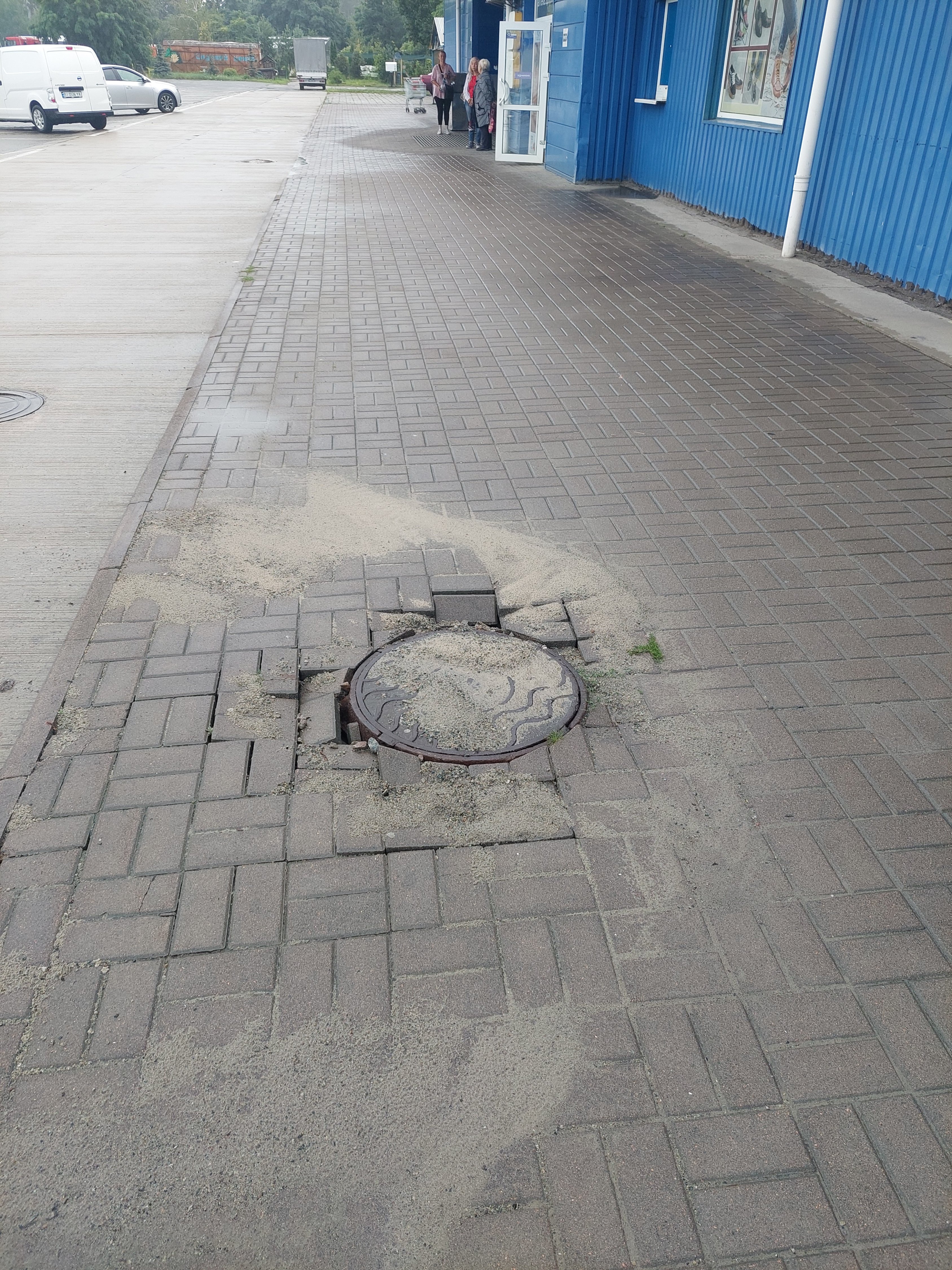 розмило підмуровку під корпусом люка, вимило щебінь і гарцовку під плиткою навколо люка...