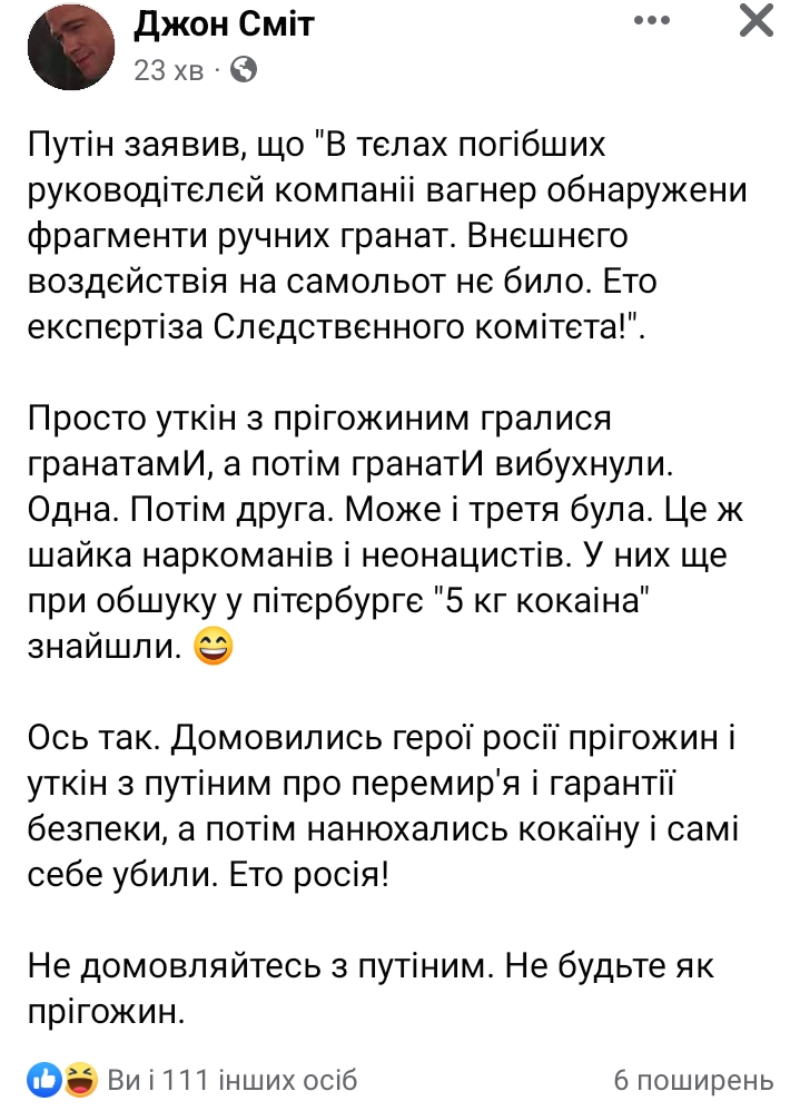 Путін заявив, що "В тєлах погібших руководітєлєй компаніі вагнер обнаружени фрагменти ручних гранат. Внєшнєго воздєйствія на самольот нє било. Ето експєртіза Слєдствєнного комітєта!".