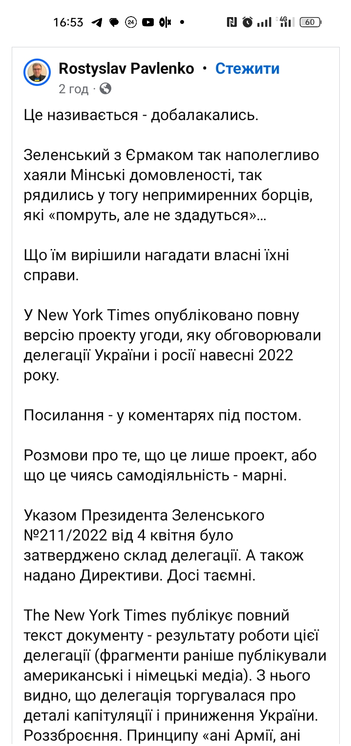 А от стаття NYT, як українські зе-очільники були не проти здати Крим Росії, прописати нейтралітет довічний, російську мову та інші гадості в Стамбулі — це дуже цікаво. Особливо цікаві там позиції про постійний нейтралітет, де фіксувалось знищення ЗСУ — було прописане обмеження всього «від бойової техніки до особового складу Збройних сил України». Наприклад, ЗСУ хотіли урізати до 85 тисяч. Київ хотів зберегти 600 систем залпового вогню з дальністю до 280 кілометрів, за задумом Росії, їх мало бути 96 з максимальною дальністю 40 кілометрів. Крім того, Москва вимагала залишити в Україні 102 винищувачі і 35 вертольотів, Київ наполягав на 160 літаках і 144 вертольотах. За російськими задумами має бути два бойових кораблі, за українськими - вісім. Тобто — це такий «мир», який би означав окупацію протягом року.