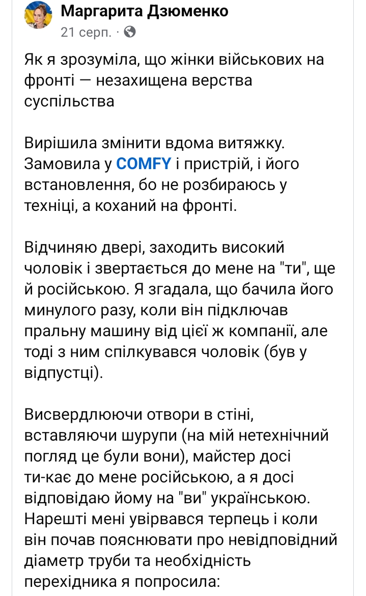 Як я зрозуміла, що жінки військових на фронті — незахищена верства суспільства Вирішила змінити вдома витяжку. Замовила у COMFY і пристрій, і його встановлення, бо не розбираюсь у техніці, а коханий на фронті. Відчиняю двері, заходить високий чоловік і звертається до мене на "ти", ще й російською. Я згадала, що бачила його минулого разу, коли він підключав пральну машину від цієї ж компанії, але тоді з ним спілкувався чоловік (був у відпустці). Висвердлюючи отвори в стіні, вставляючи шурупи (на мій нетехнічний погляд це були вони), майстер досі ти-кає до мене російською, а я досі відповідаю йому на "ви" українською. Нарешті мені увірвався терпець і коли він почав пояснювати про невідповідний діаметр труби та необхідність перехідника я попросила: — Перепрошую, ви не могли б мені не ти-кати, я ж до вас на "ви" звертаюсь. І не говорити російською. — А єслі я буду малчять на іврітє, ви мєня лутше паймьотє? — Вдома спілкуйтеся як хочете, зараз ви надаєте мені послугу. І тут з нього полились такі триповерхові мати, які мені попри весь досвід у роботі з текстами не передати. Приблизний зміст був у тому, що "повирощували неадекватів". Тут я з ним погоджусь, але боюся, що особа "неадеквата" у наших очах не збігатиметься. Кінець його спічу я зняла, прикріплюю відео. Складно передати почуття. Мій коханий зараз на фронті, у смертельній небезпеці щодня, щоб захистити мій спокій. А в його домі, якийсь мужик криє мене матами і розмахує руками. В якийсь момент я була впевнена, що можу отримати удар. Врешті він зібрався і пішов, невиразно бурмочучи про неадекватів. В нього є мій номер телефону і моя адреса. У мене вдома немає захисника. Мені страшно. (с) Посилання на видос, там стопудовий виборець zeлемського /януковища.
