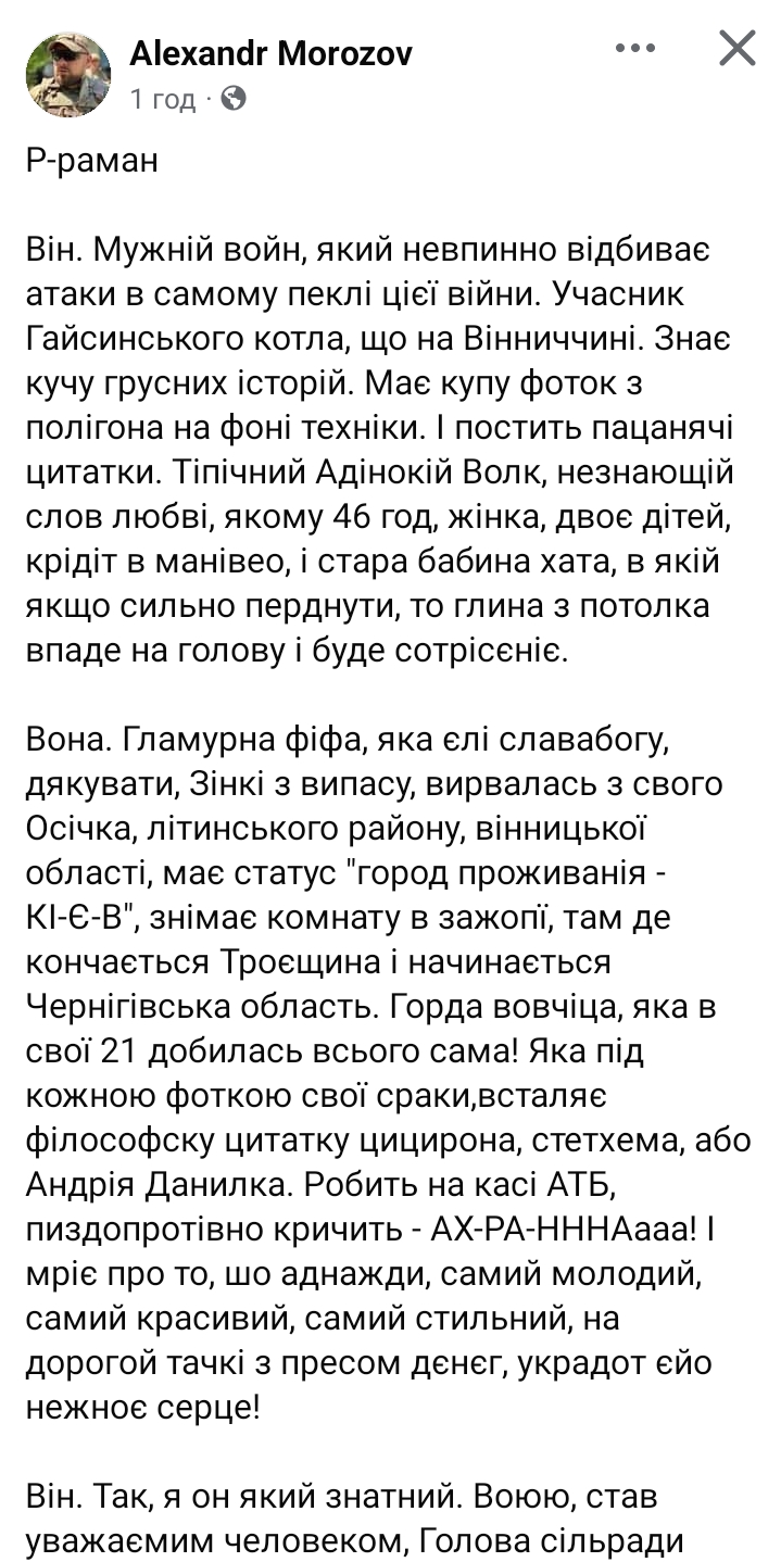 Він. Мужній войн, який невпинно відбиває атаки в самому пеклі цієї війни. Учасник Гайсинського котла, що на Вінниччині. Знає кучу грусних історій. Має купу фоток з полігона на фоні техніки. І постить пацанячі цитатки. Тіпічний Адінокій Волк, незнающій слов любві, якому 46 год, жінка, двоє дітей, крідіт в манівео, і стара бабина хата, в якій якщо сильно перднути, то глина з потолка впаде на голову і буде сотрісєніє.