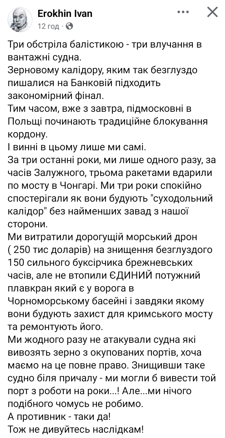 Ми жодного разу не атакували судна які вивозять зерно з окупованих портів, хоча маємо на це повне право. Знищивши таке судно біля причалу - ми могли б вивести той порт з роботи на роки...! Але...ми нічого подібного чомусь не робимо.