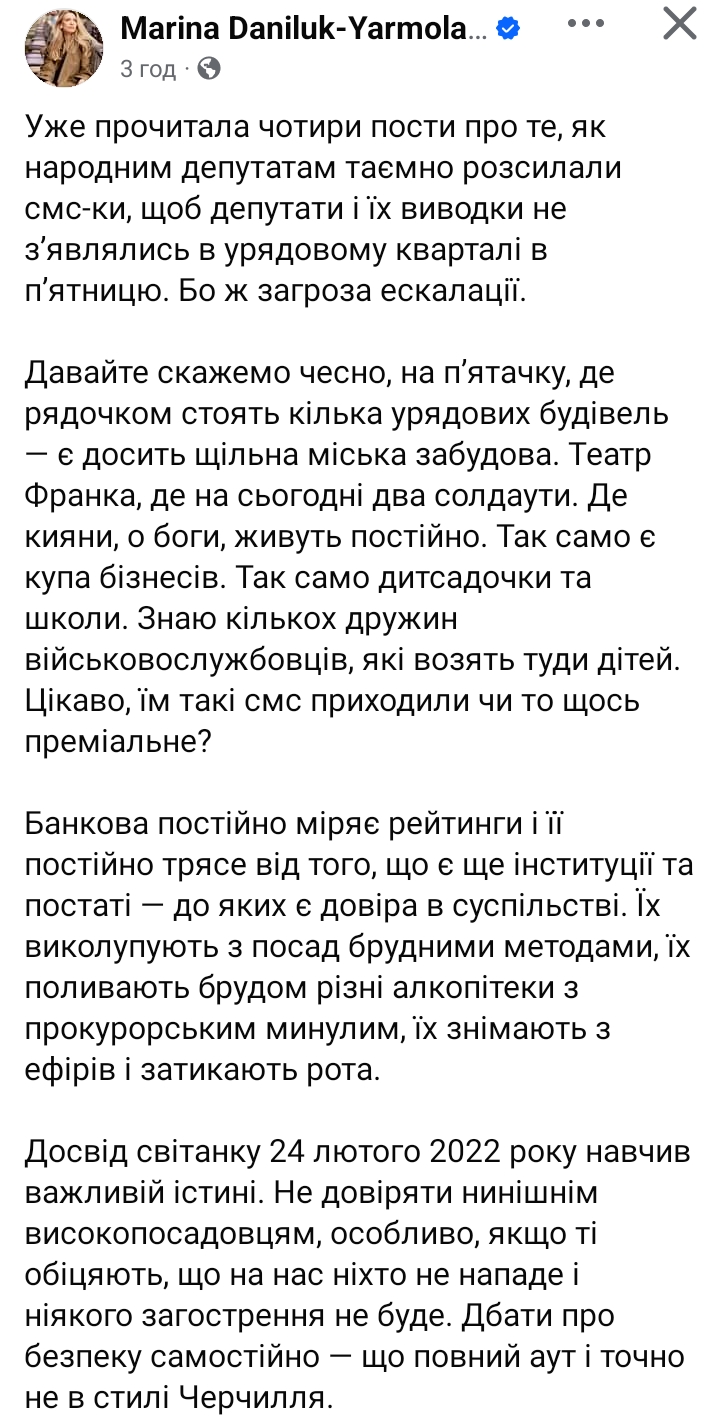 Уже прочитала чотири пости про те, як народним депутатам таємно розсилали смс-ки, щоб депутати і їх виводки не зʼявлялись в урядовому кварталі в пʼятницю. Бо ж загроза ескалації. Давайте скажемо чесно, на пʼятачку, де рядочком стоять кілька урядових будівель — є досить щільна міська забудова. Театр Франка, де на сьогодні два солдаути. Де кияни, о боги, живуть постійно. Так само є купа бізнесів. Так само дитсадочки та школи. Знаю кількох дружин військовослужбовців, які возять туди дітей. Цікаво, їм такі смс приходили чи то щось преміальне? Банкова постійно міряє рейтинги і її постійно трясе від того, що є ще інституції та постаті — до яких є довіра в суспільстві. Їх виколупують з посад брудними методами, їх поливають брудом різні алкопітеки з прокурорським минулим, їх знімають з ефірів і затикають рота. Досвід світанку 24 лютого 2022 року навчив важливій істині. Не довіряти нинішнім високопосадовцям, особливо, якщо ті обіцяють, що на нас ніхто не нападе і ніякого загострення не буде. Дбати про безпеку самостійно — що повний аут і точно не в стилі Черчилля. На практиці якось вийшло, що жирнєйші фрукти із СБУ вивозили заздалегідь смарагди і діаманти. А хтось не встиг купити квиток життя на потяг із Маріуполя. Бо наслухався Арестовича і вірив, що це на два-три тижні. Коли американське посольство каже своїм дипломатам у Києві — піти в шелтер на день і взяти собі вихідний — це турбота про своїх. Якщо хтось не розуміє — можна освіжити емоції і знання фільмом «Операція «Арго». Дуже цікава стрічка про те, як бути в руках ворога. Знаєте, що бісить. Я 10 років працювала в Раді і знаю там кожну шпаринку. І повірте, лабіринти підземних ходів в урядовому кварталі такі безпечні, що там можна сміливо жити на випадок ядерного удару. Всі ці преміальні смс свідчать лише одне — нинішні еліти вважають громадян черню, якій можна не говорити правду. Про яку не варто піклуватись. Інакше, паніка. Тільки паніка чомусь зараз не в дніпрян, які пережили перший удар у світі міжконтинентальною ракетою. Не у Сумах та в Харкові, де кожна ніч — це квест на виживання. І аж ніяк не Одеса, де відрізання хвостів русского мира проходить через криваві тортури. Кілька днів тому моє око зачепили оновлені інструкції Швеції та Фінляндії, які пояснюють своїм громадянам як виживати під час війни. Цікаво, що минулі були не такі старі — 2018 року, але їх оновили з урахуванням українських досвідів. Так от держава прописала людям, що треба купити свічки, сірники, ліхтарики, мати готівку і каністру бензину. У буклетах прописали поради для батьків. І нагадали, як правильно та організовано евакуюватись та зупиняти кровотечу. Тобто навіть самі тупенькі знатимуть, що робити, якщо за вікном Армагедон. Уявіть, якби хтось дав подібні брошури українцям бодай у січні 2022, скільки б смертей вдалось уникнути. Але ні, нас кликали на шашлики і закликали не бігти за сірниками та гречкою. І окремо. Верховній Раді нема чим зайнятись в часи війни? Уже все проголосували? (с) А нема чого додати. Так і є. Zeмельські брешуть завжди, брешуть усі, та займаються підміною реальності фейковою штучною картинкою.