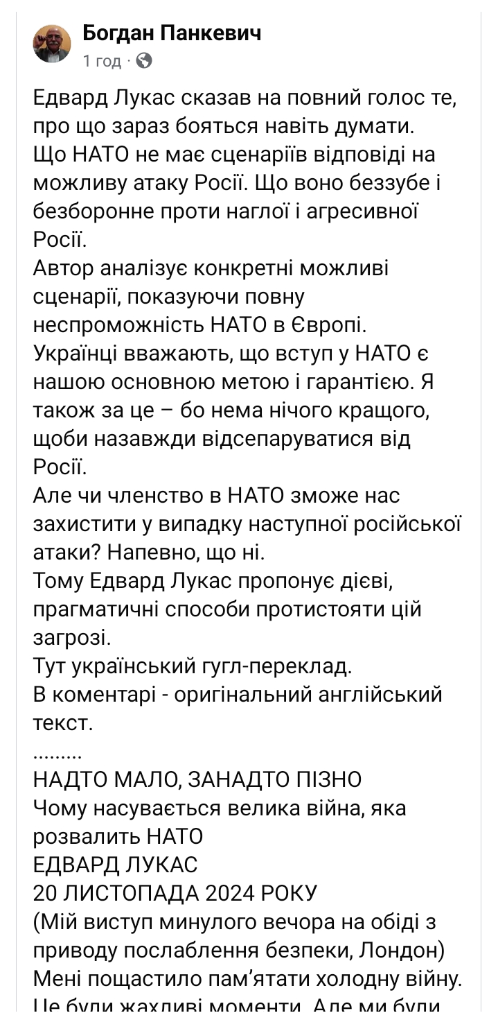 Спойлер Едвард Лукас сказав на повний голос те, про що зараз бояться навіть думати. Що НАТО не має сценаріїв відповіді на можливу атаку Росії. Що воно беззубе і безборонне проти наглої і агресивної Росії. Автор аналізує конкретні можливі сценарії, показуючи повну неспроможність НАТО в Європі. Українці вважають, що вступ у НАТО є нашою основною метою і гарантією. Я також за це – бо нема нічого кращого, щоби назавжди відсепаруватися від Росії. Але чи членство в НАТО зможе нас захистити у випадку наступної російської атаки? Напевно, що ні. Тому Едвард Лукас пропонує дієві, прагматичні способи протистояти цій загрозі. Тут український гугл-переклад. В коментарі - оригінальний англійський текст. ......... НАДТО МАЛО, ЗАНАДТО ПІЗНО Чому насувається велика війна, яка розвалить НАТО ЕДВАРД ЛУКАС 20 ЛИСТОПАДА 2024 РОКУ (Мій виступ минулого вечора на обіді з приводу послаблення безпеки, Лондон) Мені пощастило пам’ятати холодну війну. Це були жахливі моменти. Але ми були частиною сильного альянсу. Ми були більшими, сильнішими і багатшими за наших супротивників. Наша система спрацювала. Їхня - ні. У нас були ідеї, в які ми вірили. І ми вели справжню війну проти супротивника - рівного, якого ми пам’ятаємо. Зараз нічого з цього не відповідає дійсності. Наш альянс розділений і розсіяний. Ми вже були свідками примхливої ненадійності минулих адміністрацій США. Ця, мабуть, буде ще гіршою. Інші економічні та політичні моделі, здається, працюють краще, ніж наша. І наші збройні сили не готові до війни, яка насувається. Я все життя попереджав про це. У 1980-х я проводив кампанію проти комунізму та висвітлював крах комунізму. Мене заарештували, побили, допитували та депортували комуністичні сили таємної поліції. Після 1991 року, живучи в країнах Балтії, мені було абсолютно зрозуміло, що Росія не є перспективним ринком, що розвивається, і надійним партнером у сфері безпеки, якими їх зображує загальноприйнята думка. Нею керували шахраї та тіньові сили з укоріненою імперіалістичною позицією, що становило найбільшу небезпеку для її сусідів. Коктейль брудних трюків, застосованих у країнах Балтії та інших країнах, включав пропаганду, підкуп, фізичне залякування, підривну діяльність, диверсію та психологічну війну. Звучить знайомо? Росія також використовувала історію як зброю, фальшиво звинувачуючи інші країни в нацизмі, ігноруючи той факт, що її власна імперія насправді тримається на основі масових вбивств, поєднаних з брехнею. Вони нас попереджували. Такі люди, як колишній президент Естонії Леннарт Мері під час виступу в 1994 році в Гамбурзі. Його передбачливе попередження про небезпеку, що радянська ностальгія є основою нового кремлівського імперіалізму, настільки розлютило лідера російської делегації, що він пішов, грюкнувши за собою дверима. Цікаво, чи хтось здогадається, ким він був? Ось підказка. Керував комітетом зовнішньоекономічних зв'язків міста Санкт-Петербурга. Путін Володимир Володимирович. У цю неісторичну епоху нам може бути важко зрозуміти, що політизована інтерпретація минулого зараз є тараном путіністської ідеології, особливо в твердженнях, що Україна насправді не є справжньою країною. Майбутні історики будуть дивуватися, чому історична війна Путіна в Україні не була передбачена та попереджена. Бо на кожному попередньому етапі протистояти Путіну б