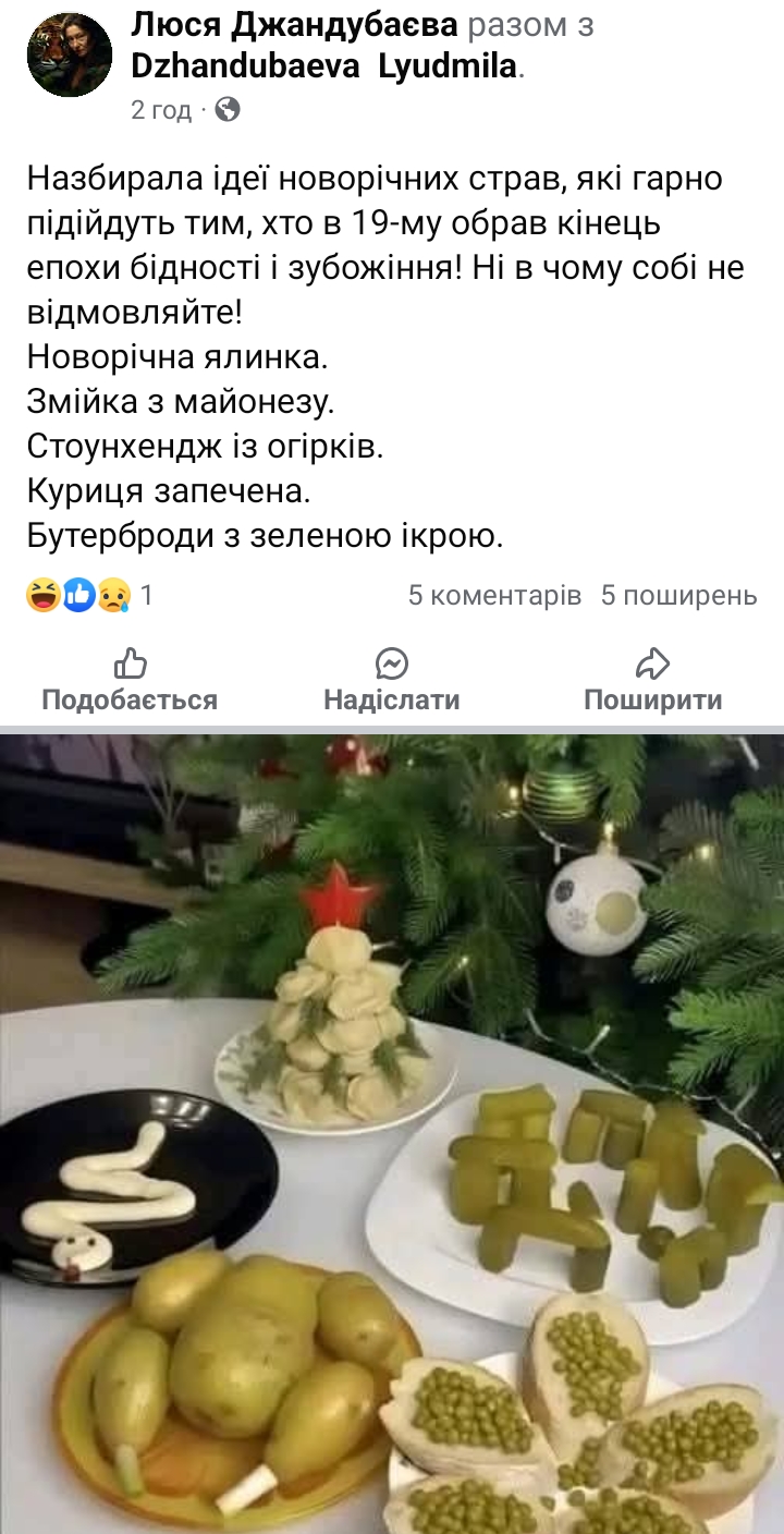 Назбирала ідеї новорічних страв, які гарно підійдуть тим, хто в 19-му обрав кінець епохи бідності і зубожіння! Ні в чому собі не відмовляйте! Новорічна ялинка. Змійка з майонезу. Стоунхендж із огірків. Куриця запечена. Бутерброди з зеленою ікрою. Пс. Як припинити волати)))))