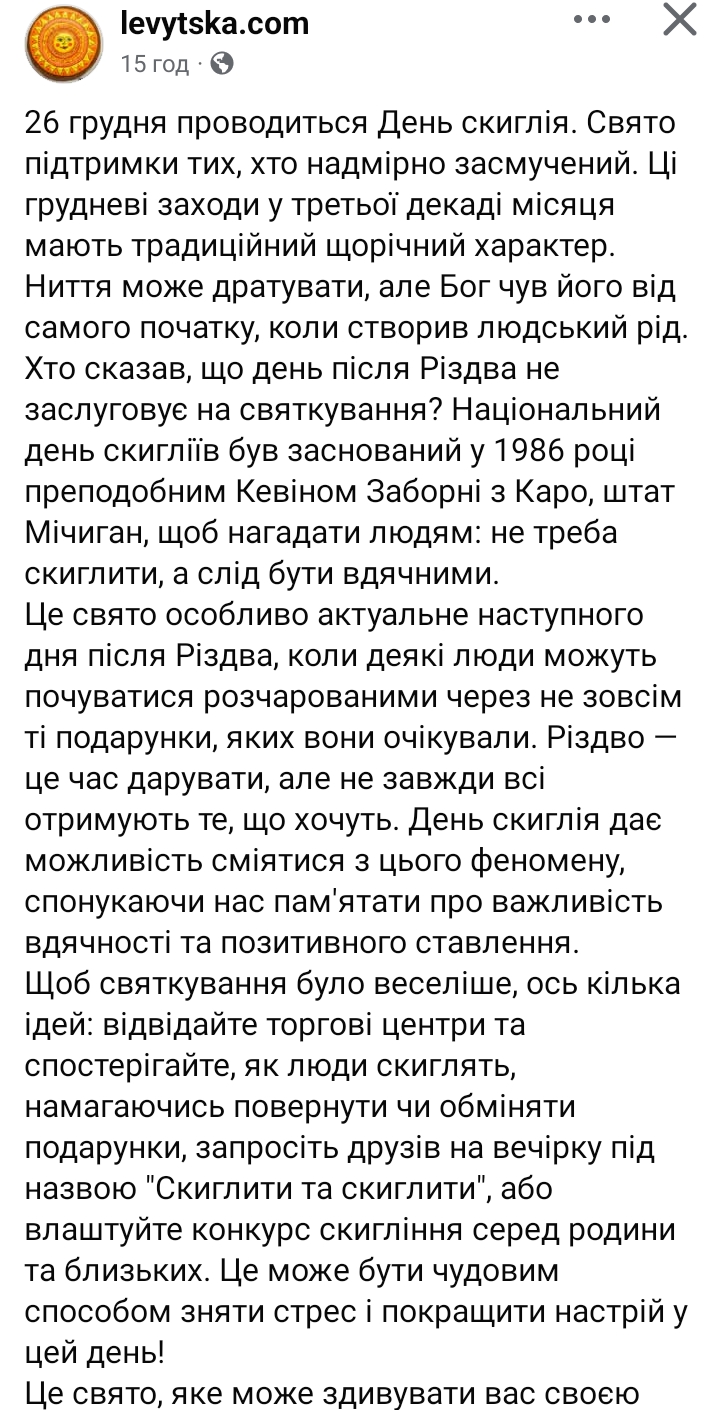 26 грудня проводиться День скиглія. Свято підтримки тих, хто надмірно засмучений. Ці грудневі заходи у третьої декаді місяця мають традиційний щорічний характер. Ниття може дратувати, але Бог чув його від самого початку, коли створив людський рід. Хто сказав, що день після Різдва не заслуговує на святкування? Національний день скигліїв був заснований у 1986 році преподобним Кевіном Заборні з Каро, штат Мічиган, щоб нагадати людям: не треба скиглити, а слід бути вдячними. Це свято особливо актуальне наступного дня після Різдва, коли деякі люди можуть почуватися розчарованими через не зовсім ті подарунки, яких вони очікували. Різдво — це час дарувати, але не завжди всі отримують те, що хочуть. День скиглія дає можливість сміятися з цього феномену, спонукаючи нас пам'ятати про важливість вдячності та позитивного ставлення. Щоб святкування було веселіше, ось кілька ідей: відвідайте торгові центри та спостерігайте, як люди скиглять, намагаючись повернути чи обміняти подарунки, запросіть друзів на вечірку під назвою "Скиглити та скиглити", або влаштуйте конкурс скигління серед родини та близьких. Це може бути чудовим способом зняти стрес і покращити настрій у цей день! Це свято, яке може здивувати вас своєю оригінальністю, нагадуючи про важливість сміху й підтримки в моменти розчарувань. (с) Піду ще постраждаю ))) Хто зі мною? (с) Трахаюсь зі підключенням бойлера. Фітінгі, шмітінгі, фуми... Усе трошки раком. Завтра міняти масло у фіаті в умовах багнюки. Таке....