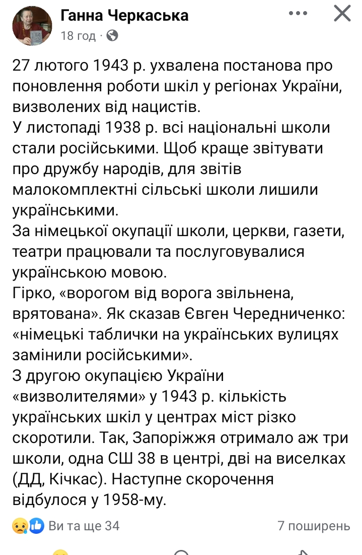 З другою окупацією України «визволителями» у 1943 р. кількість українських шкіл у центрах міст різко скоротили. Так, Запоріжжя отримало аж три школи, одна СШ 38 в центрі, дві на виселках (ДД, Кічкас). Наступне скорочення відбулося у 1958-му. (с)