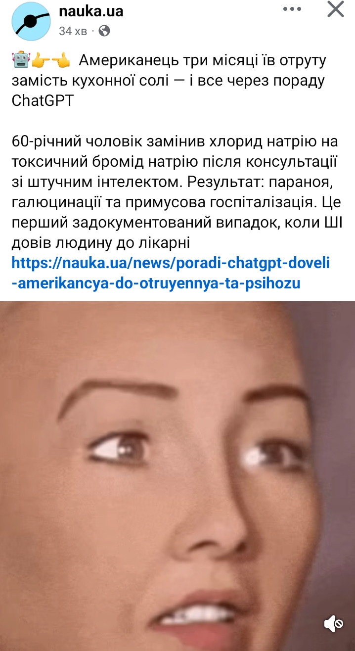 Американец-вегетарианец решил оздоровиться и спросил у ChatGPT, чем заменить соль. Нейросеть «посоветовала» белый порошок без запаха — бромид натрия. Он послушался. Три месяца питался так каждый день.