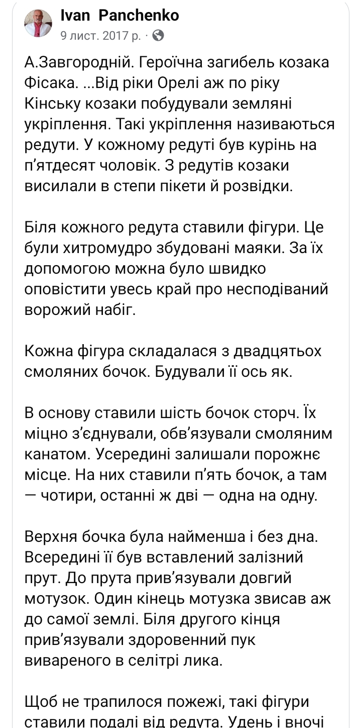 А.Завгородній. Героїчна загибель козака Фісака. ...Від ріки Орелі аж по ріку Кінську козаки побудували земляні укріплення. Такі укріплення називаються редути. У кожному редуті був курінь на п’ятдесят чоловік. З редутів козаки висилали в степи пікети й розвідки. Біля кожного редута ставили фігури. Це були хитромудро збудовані маяки. За їх допомогою можна було швидко оповістити увесь край про несподіваний ворожий набіг. Кожна фігура складалася з двадцятьох смоляних бочок. Будували її ось як. В основу ставили шість бочок сторч. Їх міцно з’єднували, обв’язували смоляним канатом. Усередині залишали порожнє місце. На них ставили п’ять бочок, а там — чотири, останні ж дві — одна на одну. Верхня бочка була найменша і без дна. Всередині її був вставлений залізний прут. До прута прив’язували довгий мотузок. Один кінець мотузка звисав аж до самої землі. Біля другого кінця прив’язували здоровенний пук вивареного в селітрі лика. Щоб не трапилося пожежі, такі фігури ставили подалі від редута. Удень і вночі біля кожної пильнували вартові. Від редута до редута снували козаки, чоловік по п’ять і більше. Як вгледять татарву, то й чкурнуть до укріплення. Там осавул звелить запалювать фігуру. По інших редутах побачать і собі запалюють. Так в одну годину козаки увесь край оповістять, щоб люди рятувалися. Але так сталося що ворог був помічений надто запізно. Тож козак Фісак ціною власного життя зумів підпалити фігуру. Сталася ця подія в середині 18ст. Запорізька обл. Оріхівський р-н смт Комишуваха. Залізнична станція називається Фісаки, на честь козака. (с) От єслі б zeмельський у ті часи був пересідєнтом, то казав би "татари тожє люді, ані нє будут вас рубать".