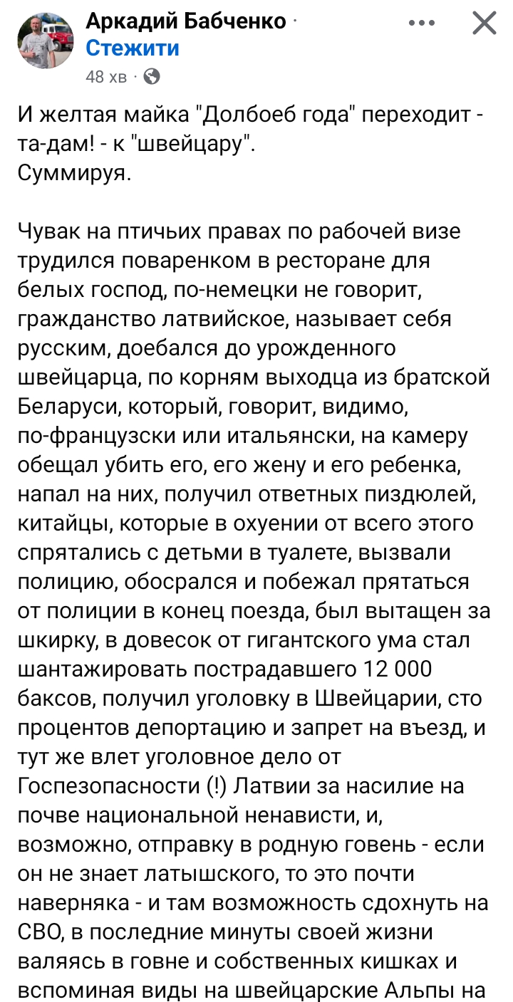 Чувак на птичьих правах по рабочей визе трудился поваренком в ресторане для белых господ, по-немецки не говорит, гражданство латвийское, называет себя русским, доебался до урожденного швейцарца, по корням выходца из братской Беларуси, который, говорит, видимо, по-французски или итальянски, на камеру обещал убить его, его жену и его ребенка, напал на них, получил ответных пиздюлей, китайцы, которые в охуении от всего этого спрятались с детьми в туалете, вызвали полицию, обосрался и побежал прятаться от полиции в конец поезда, был вытащен за шкирку, в довесок от гигантского ума стал шантажировать пострадавшего 12 000 баксов, получил уголовку в Швейцарии, сто процентов депортацию и запрет на въезд, и тут же влет уголовное дело от Госпезопасности (!) Латвии за насилие на почве национальной ненависти, и, возможно, отправку в родную говень - если он не знает латышского, то это почти наверняка - и там возможность сдохнуть на СВО, в последние минуты своей жизни валяясь в говне и собственных кишках и вспоминая виды на швейцарские Альпы на берегу Женевского озера, с зарплатой во франках, обмакивая шоколад в фондю и запивая его бокалом Adank Flascher Pinot Noir Herrenacker Graubunden 2018 года.