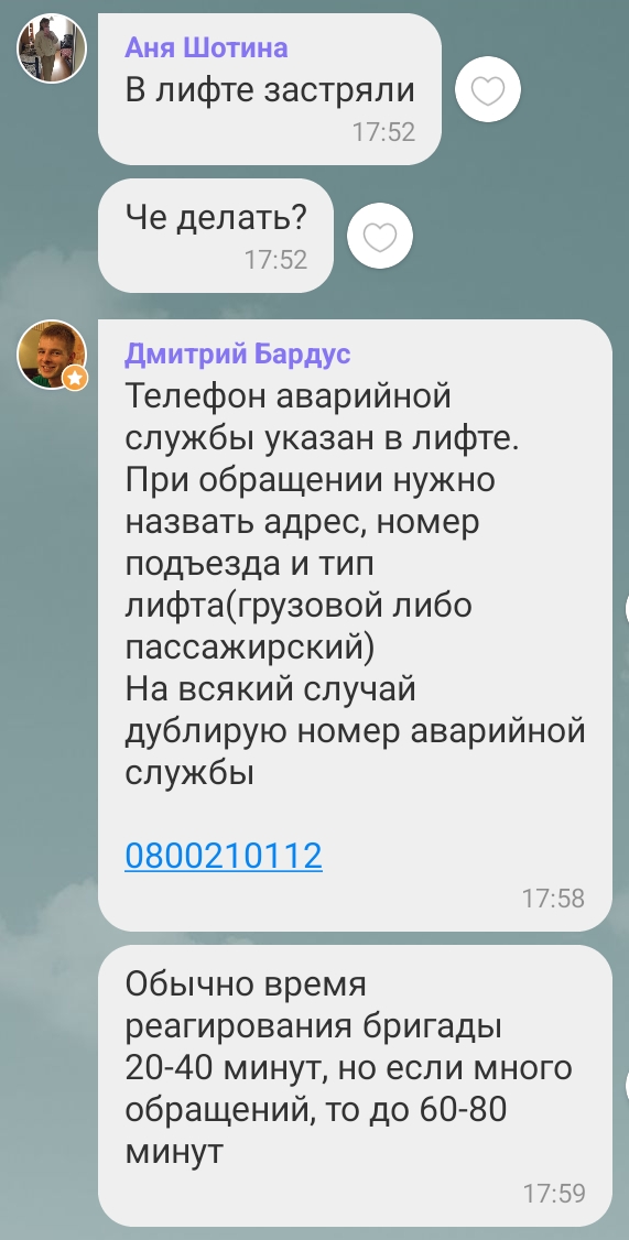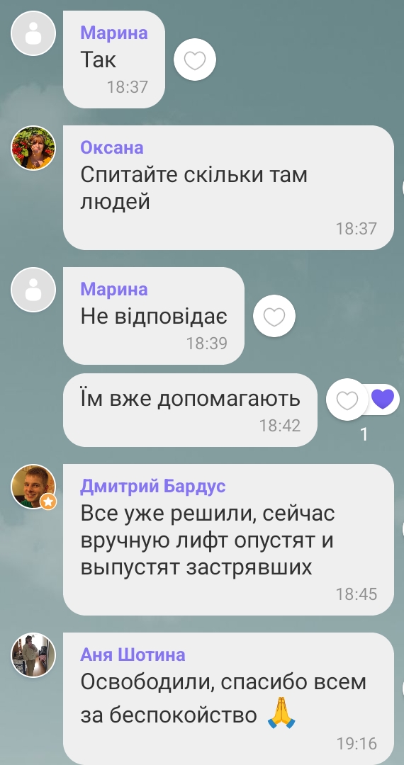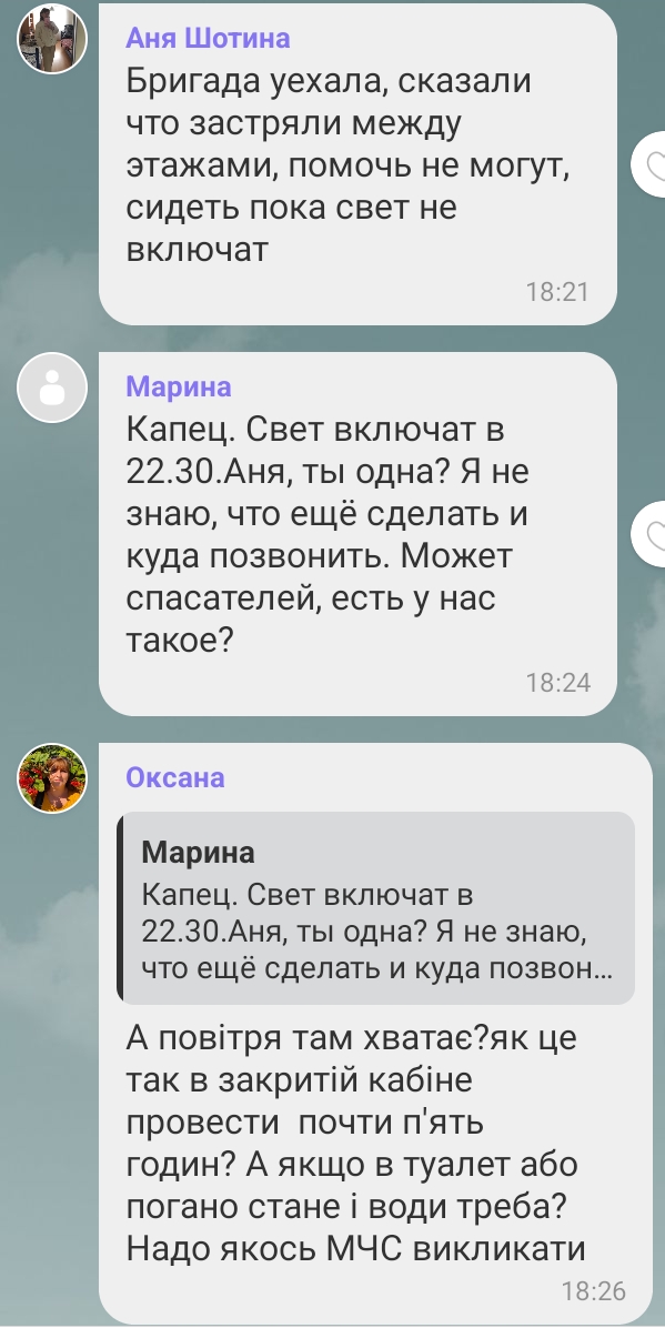 незнаю хто то писав але: 1) бригаді (ліфтеру - електромеханік по ремонту і експлуатації ліфтів) пофіг ДЕ застряли: між етажами чи на етажу і вони не поїдуть покинувши застряглих... 2) витягують застрявших підніманням кабіни а не опусканням...для цього спеціальним ричагом розтормажують тормоз приводу ліфта і під вагою противоваги кабіна починає рухатись вверх до найближчого етажа...спочатку повільно а потім якщо пасажирів мало (малий груз) доводиться навіть притормажувати...натискаєш з силою ричаг - розтормажуєш і ліфт йде вверх..відпустив ричаг - тормоз зупиняє кабіну. щоб опустити кабіну потрібно одному розтормозити тормоз а іншому намагатиськрутити шків машини...це досить важко...так ніхто ніколи не робить... 3) в шахті ліфта як паравило маленька тяга...повітря вистачить сидіти - не пересидіти... ПС1: в кінці 90х, початку 2000х був відповідальним за експлуатацію ліфтів на заводі...в підпорядкуванні були ліфтери...сам ліфти не ремонтував але декілька разів діставав застрягших, міг перезапустити ліфт, відкрити зачинені двері ліфта як з середини так і ззовні...ліфти совкові армянські заводу Спітак... ПС2: можливо в сучасних ліфтах щось по другому але принципи думаю ті ж самі...більше 20 років не проходив переатестацію по ліфтам
