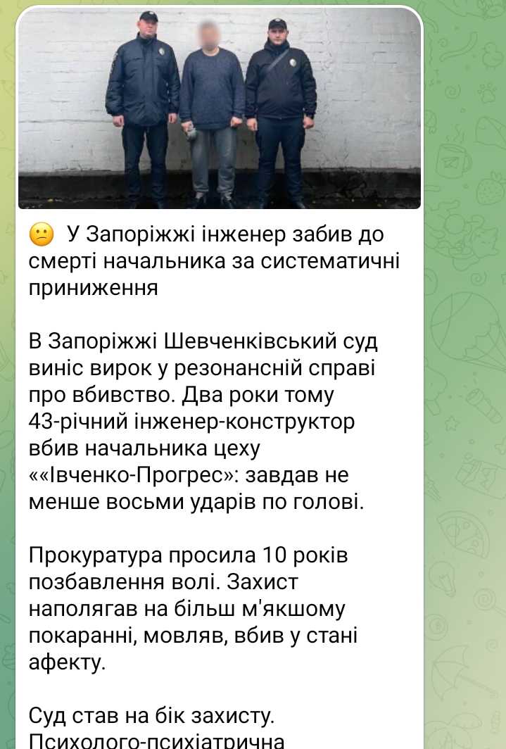 У Запоріжжі інженер забив до смерті начальника за систематичні приниження В Запоріжжі Шевченківський суд виніс вирок у резонансній справі про вбивство. Два роки тому 43-річний інженер-конструктор вбив начальника цеху ««Івченко-Прогрес»: завдав не менше восьми ударів по голові. Прокуратура просила 10 років позбавлення волі. Захист наполягав на більш м'якшому покаранні, мовляв, вбив у стані афекту. Суд став на бік захисту. Психолого-психіатрична експертиза підтвердила, що інженер діяв у стані кумулятивного афекту, що обмежило здатність усвідомлювати свої дії та передбачати наслідки. Саме тривале системне приниження стало причиною цього. Суд призначив 5 років позбавлення волі — мінімально можливе покарання за цією статтею.(с) Країна мрій пізделенського)))) Доречі, пізделенський патрушева - хламіндіча систематично принижує пів країни щонайменше, який дивний збіг)))