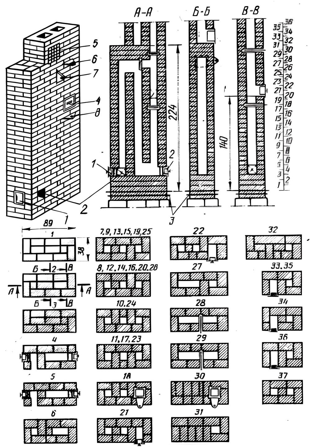 Рис. 15. Отопительный щиток: 1 – прочистные отверстия или дверки; 2 – место подсоединения чугунной печки или плиты; 3 – гидроизоляция; 4 – место присоединения самоварной трубы; 5 – вентиляционная решетка; 6, 7, 8 – задвижки