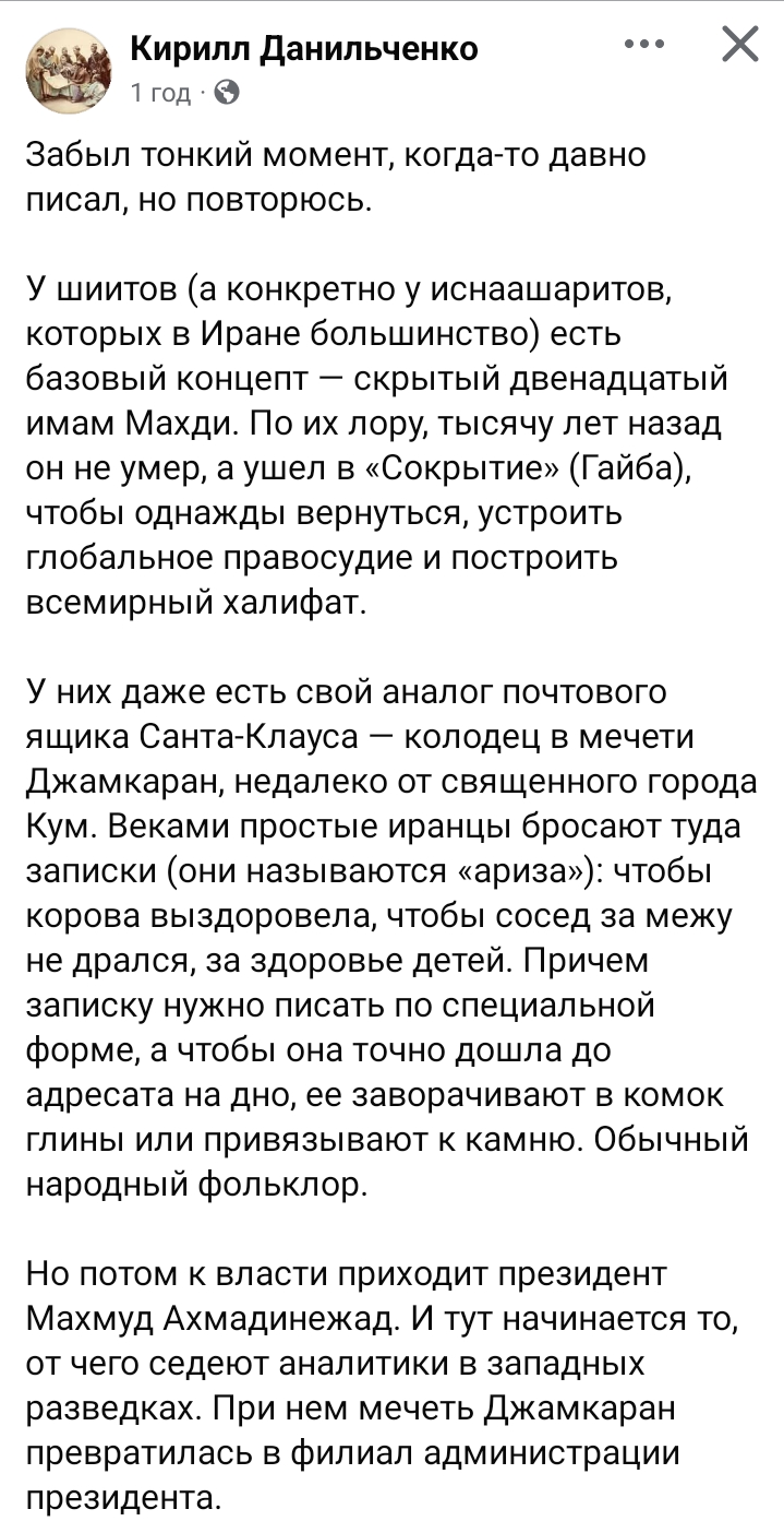 Спойлер Забыл тонкий момент, когда-то давно писал, но повторюсь. У шиитов (а конкретно у иснаашаритов, которых в Иране большинство) есть базовый концепт — скрытый двенадцатый имам Махди. По их лору, тысячу лет назад он не умер, а ушел в «Сокрытие» (Гайба), чтобы однажды вернуться, устроить глобальное правосудие и построить всемирный халифат. У них даже есть свой аналог почтового ящика Санта-Клауса — колодец в мечети Джамкаран, недалеко от священного города Кум. Веками простые иранцы бросают туда записки (они называются «ариза»): чтобы корова выздоровела, чтобы сосед за межу не дрался, за здоровье детей. Причем записку нужно писать по специальной форме, а чтобы она точно дошла до адресата на дно, ее заворачивают в комок глины или привязывают к камню. Обычный народный фольклор. Но потом к власти приходит президент Махмуд Ахмадинежад. И тут начинается то, от чего седеют аналитики в западных разведках. При нем мечеть Джамкаран превратилась в филиал администрации президента. В 2005 году, на первом же заседании своего кабинета, Ахмадинежад заставил всех министров подписать официальный «договор на верность» Махди. Документ торжественно отвезли в Кум и сбросили в тот самый колодец. Заседания Кабмина Ирана проводились с оглядкой на дно этой ямы. Они на полном серьезе оставляли пустой стул во главе стола для тысячелетнего призрака — на случай, если Махди внезапно вылезет из колодца, займет свое место и заодно проверит доклад министра ЖКХ. Туда же, по слухам, сбрасывали копии проектов государственного бюджета на утверждение. Но шиза пошла дальше кабинетов. Ахмадинежад выделил сотни миллионов долларов из реального госбюджета (нефтяных денег!), чтобы построить гигантскую автомагистраль от Тегерана до мечети Джамкаран, с новыми развязками и отелями. Знаете зачем? Это официально озвучивалось: чтобы, когда Махди выйдет из Сокрытия, не образовалась пробка, и его кортеж вместе с миллионами паломников мог без проблем добраться до столицы. Они буквально строили дорожную логистику для апокалипсиса. А теперь представьте степень ошеломления израильского командования. Вот ты сидишь в Генштабе ЦАХАЛа или в Пентагоне. У тебя есть теория игр, концепция взаимного гарантированного уничтожения, выверенный баланс сил. Ты привык иметь дело с рациональными ублюдками, которые хотят власти, денег и спокойно встретить старость в Лондоне. И тут перед тобой страна, стоящая в шаге от создания ядерной бомбы. И ее руководство буквально кидает государственный бюджет в колодец, строит шоссе для призрака и целенаправленно провоцирует глобальную войну. Почему? Потому что по их методичке пришествие Махди должно начаться аккурат после великой мировой бойни с «неверными». Для них потенциальные прилеты по соседним странам — от Турции и Кипра до Азербайджана — это не геополитический провал. Это та самая священная Кербела. Та историческая битва, в которой мученически погибли их святые. Они сознательно идут на мученичество, чтобы ускорить возвращение Махди. Хаос — это не побочный эффект их политики, это её главная цель. По логике этой шизы, весьма вероятно, что где-то в сейфе у каждого командира ракетного дивизиона КСИР лежат «красные пакеты» с целями. На случай, если связи не будет, а аятолл и верхушку командования обнулят превентивным ударом. И когда связь окончательно 