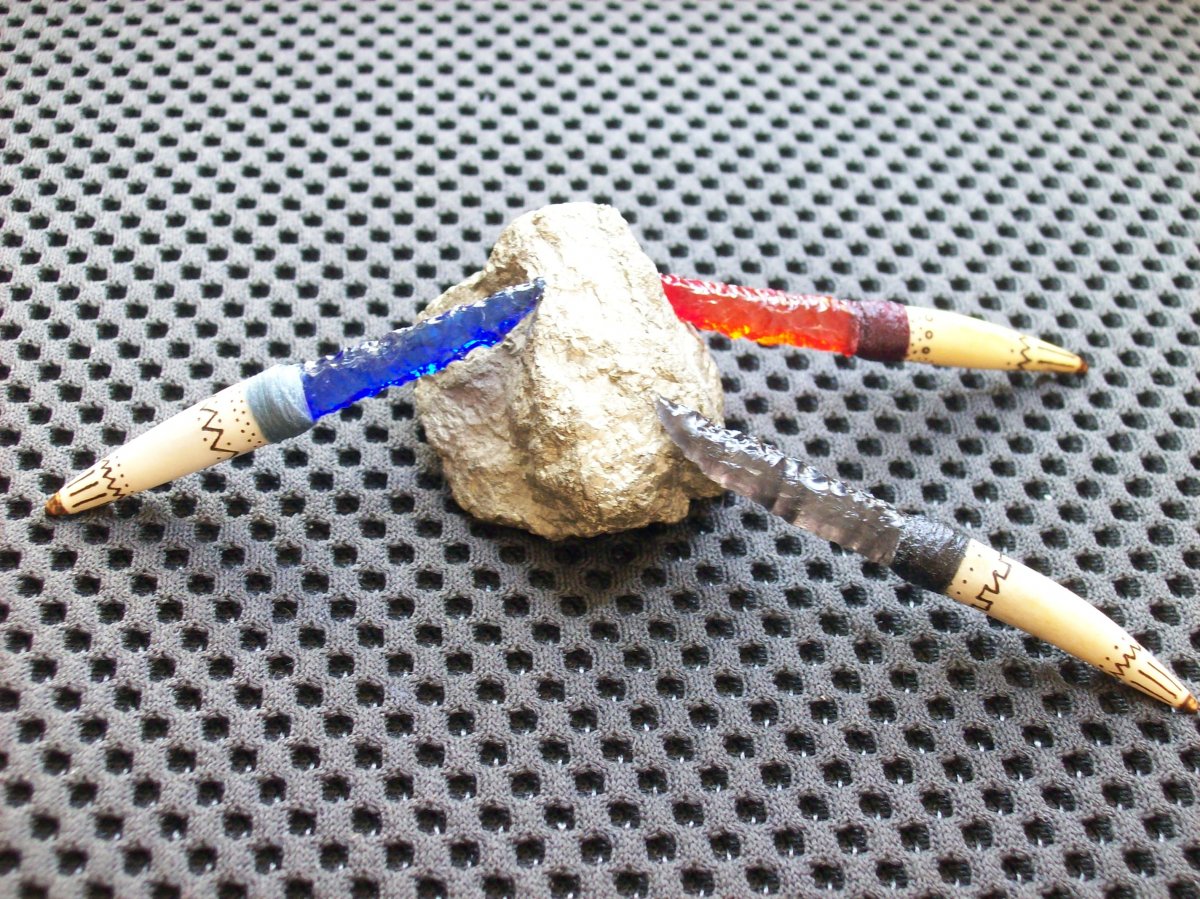 Вот , хвастаюсь - закончил сегодня трио мининожечгов ... решил добавить в экспозицию новое - джеспиллит ( железистый кварцит ) . Обсидиан , селеновый рубин (красный) , кобальтовое стекло (синий ) , подставка - бук . Такой себе ритуальный наборчик ...