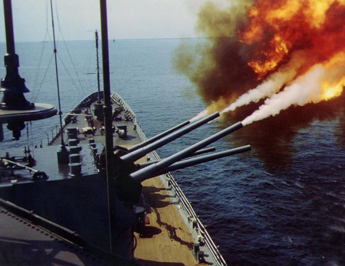 Тяжёлый крейсер типа "Baltimore" USS Saint Paul (CA-73) ВМС США оказывает поддержку из 203 мм. орудий главного калибра в октябре 1966г.