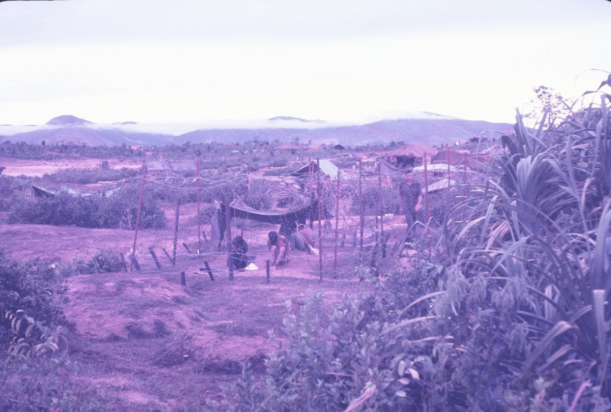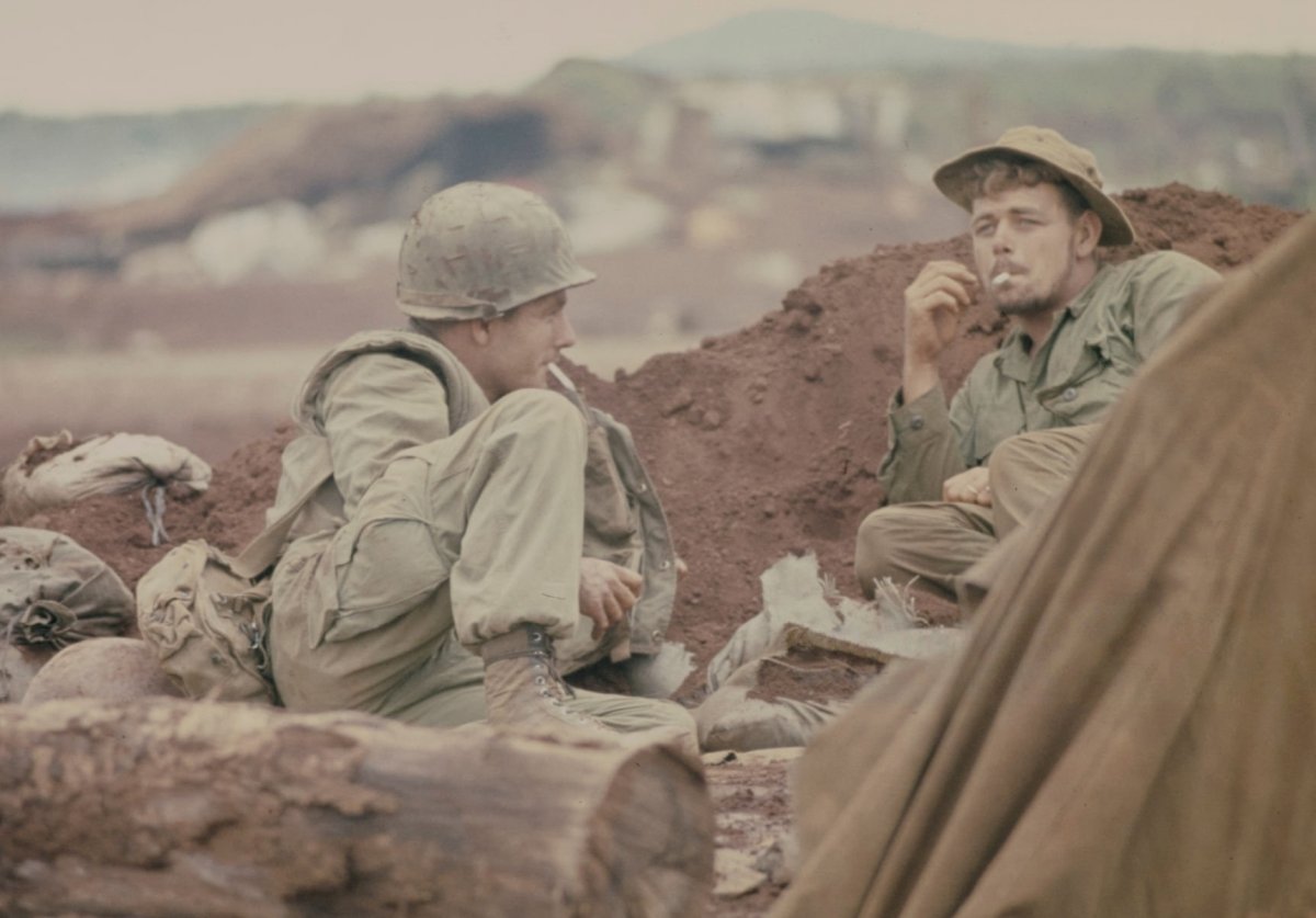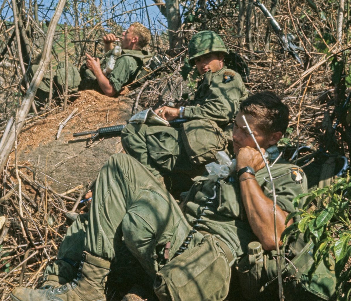 Солдаты базы огневой поддержки Aries на небольшой поляне в джунглях, в зоне D боевых действий, в 50 км от Сайгона, курят марихуану, используя для пущего эффекта ствол дробовика "Ральф".