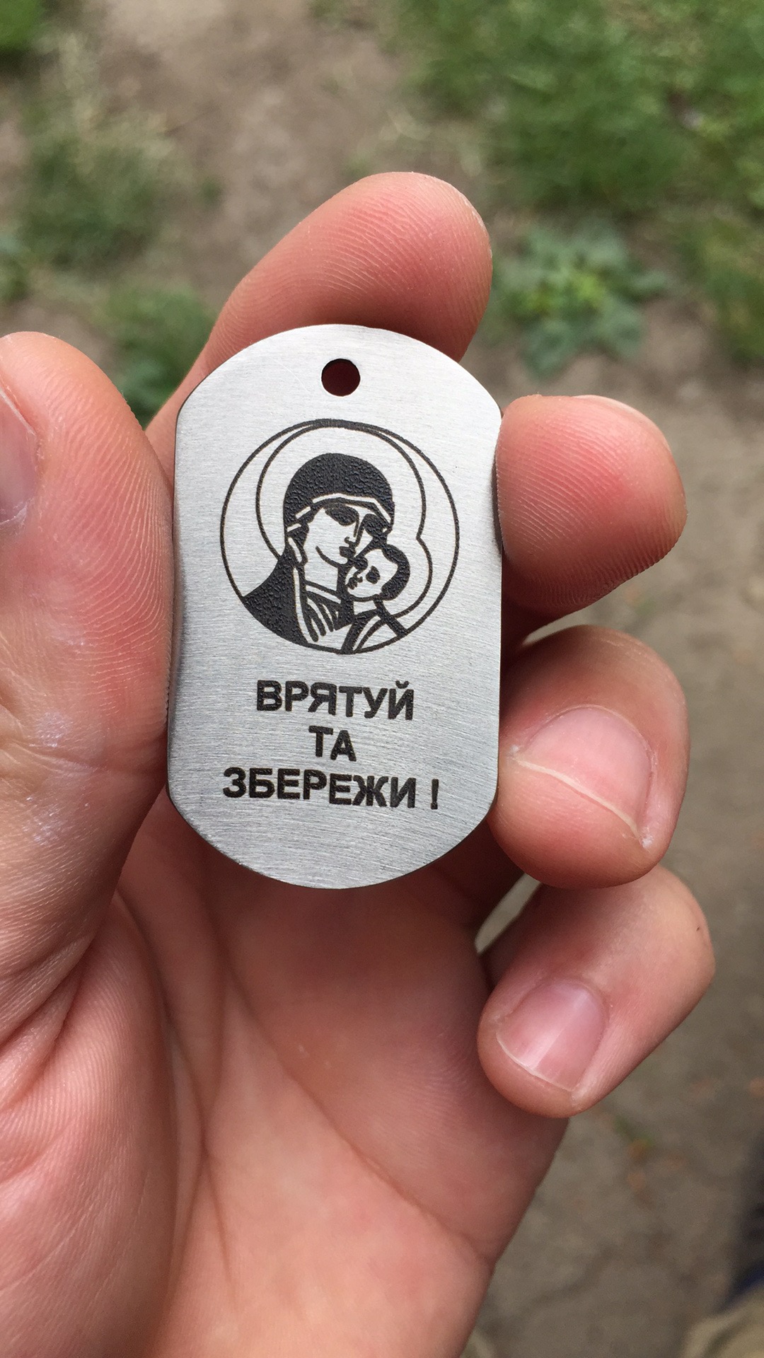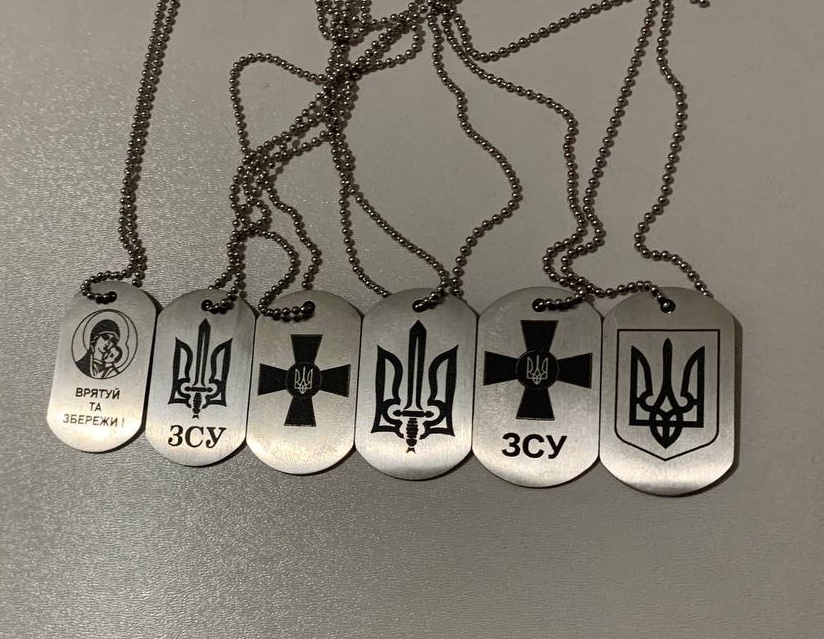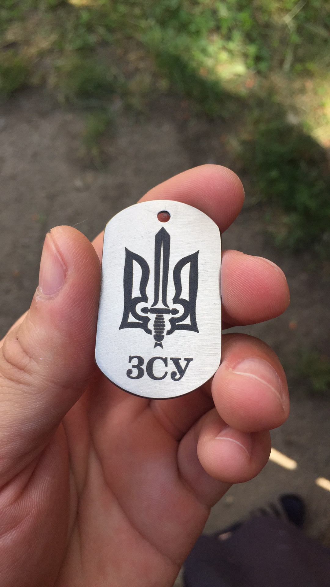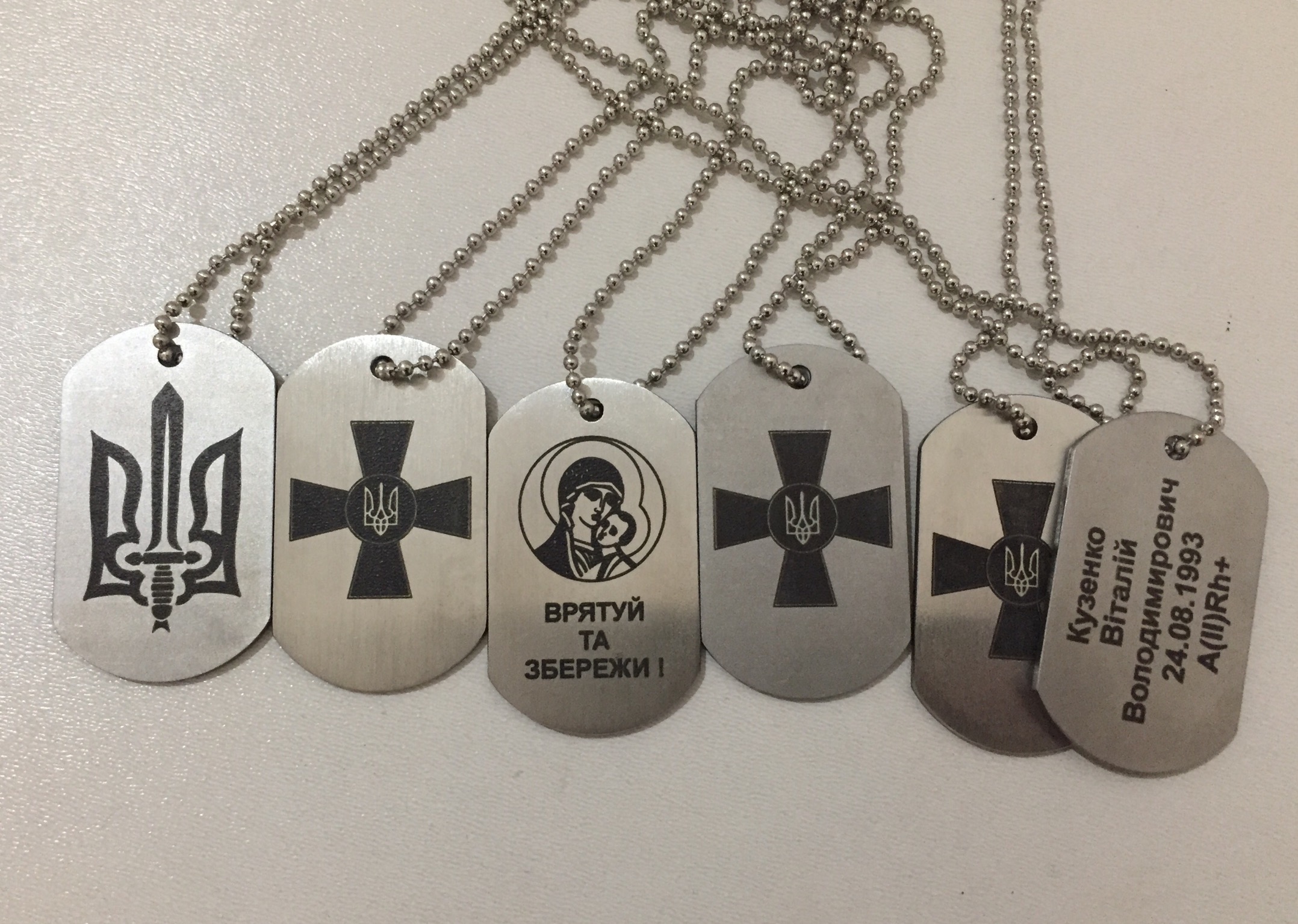 Слава Україні ! Жетони з гравіровкою. Жетон нержавійка,46*27*1.5 мм. Шарікова цепочка 2 мм.Довжина 70 см. Гравіровка з обох сторін(глибина відчутна ). Стророна А малюнок на вибір по номеру. Сторона Б ваші дані(на фото зразок). Відправка новою поштою, оплата на картку,після готовності. Ціна 150 грн.З повагою Віталій.