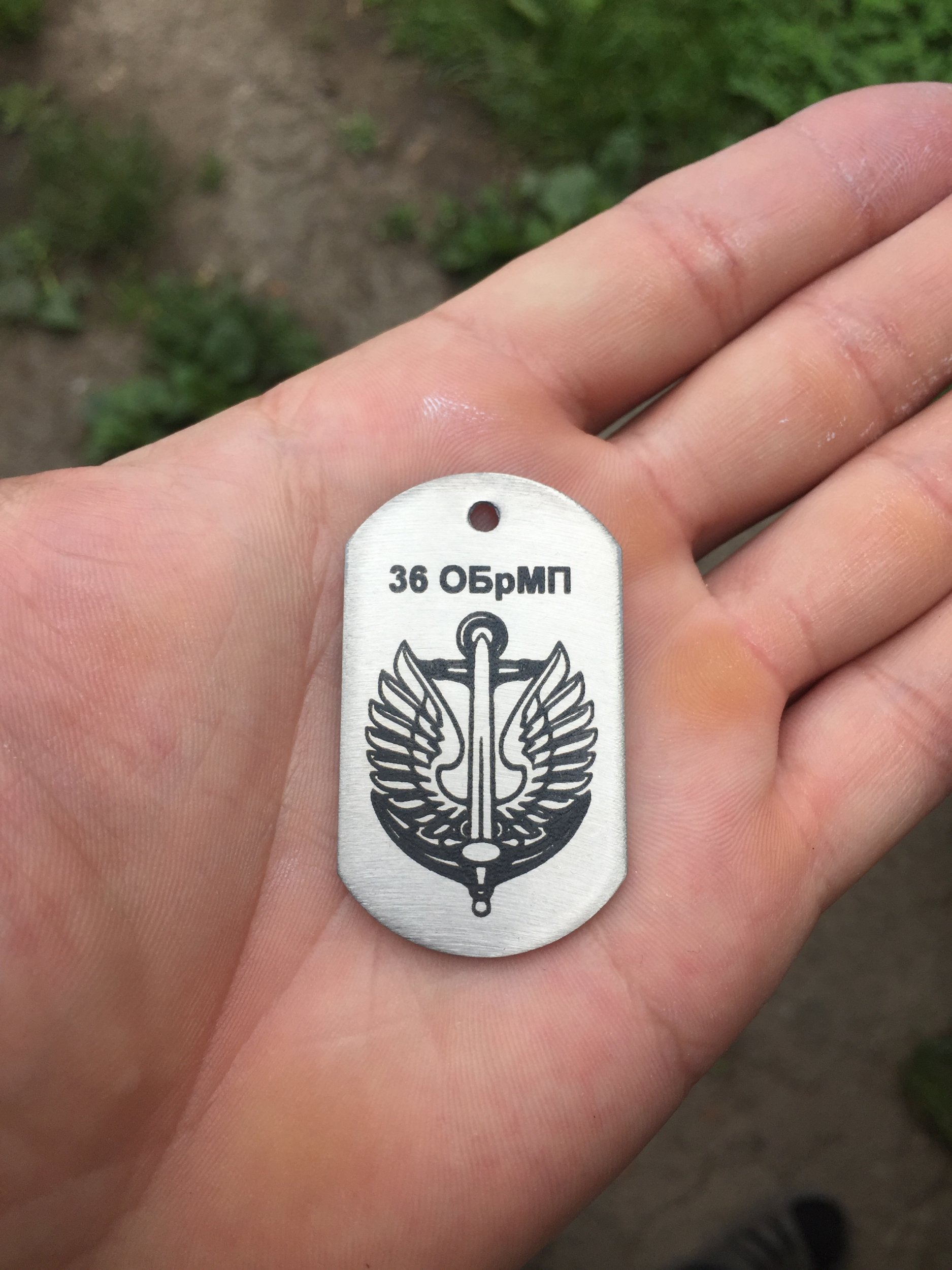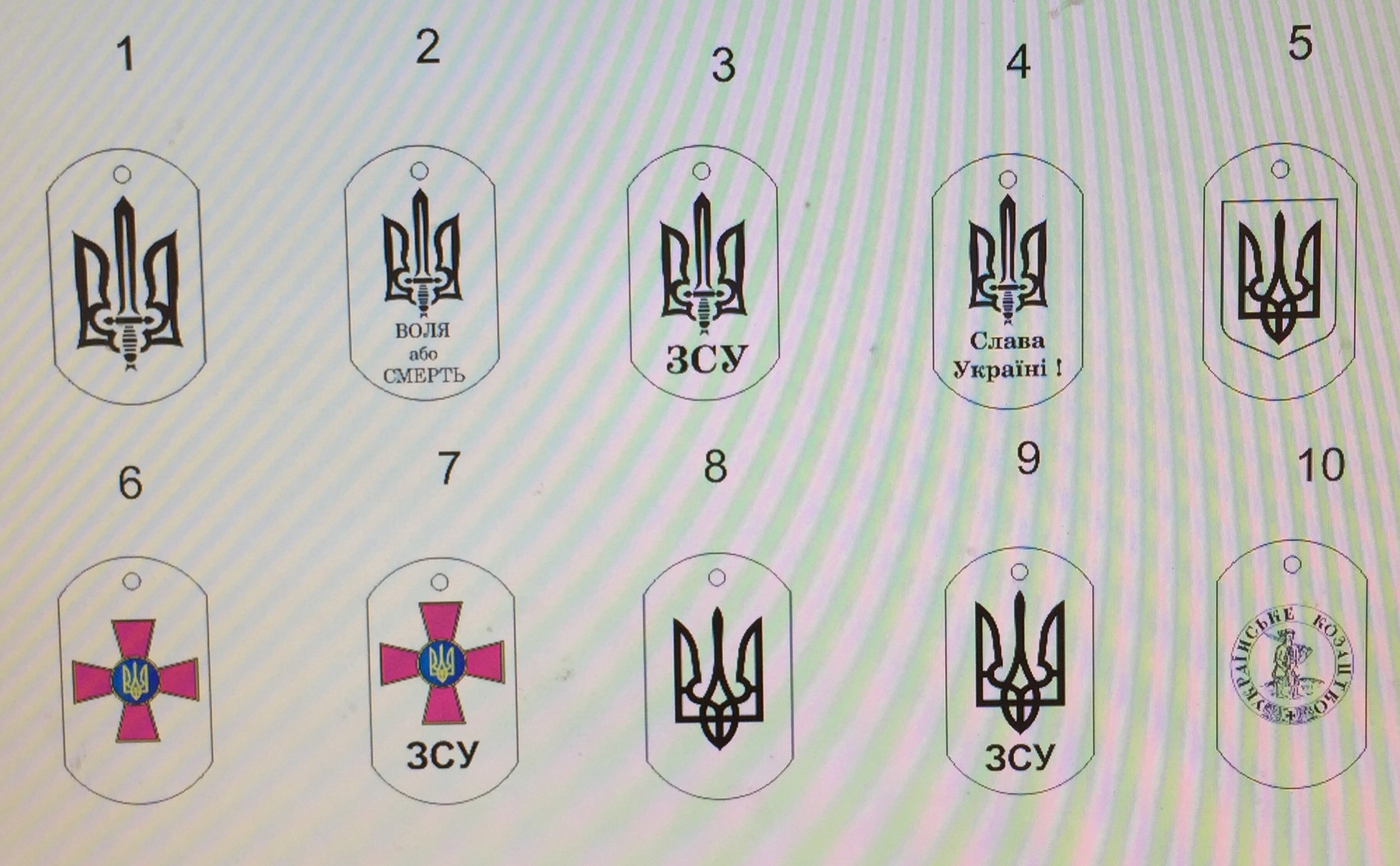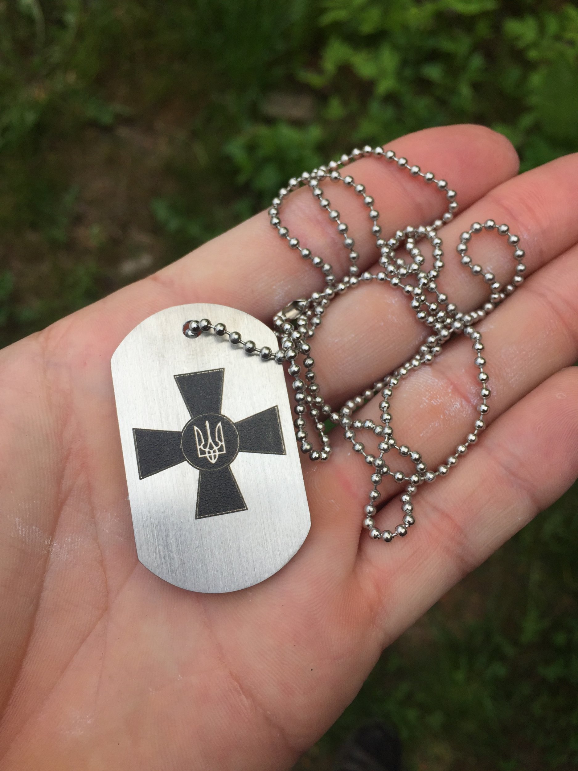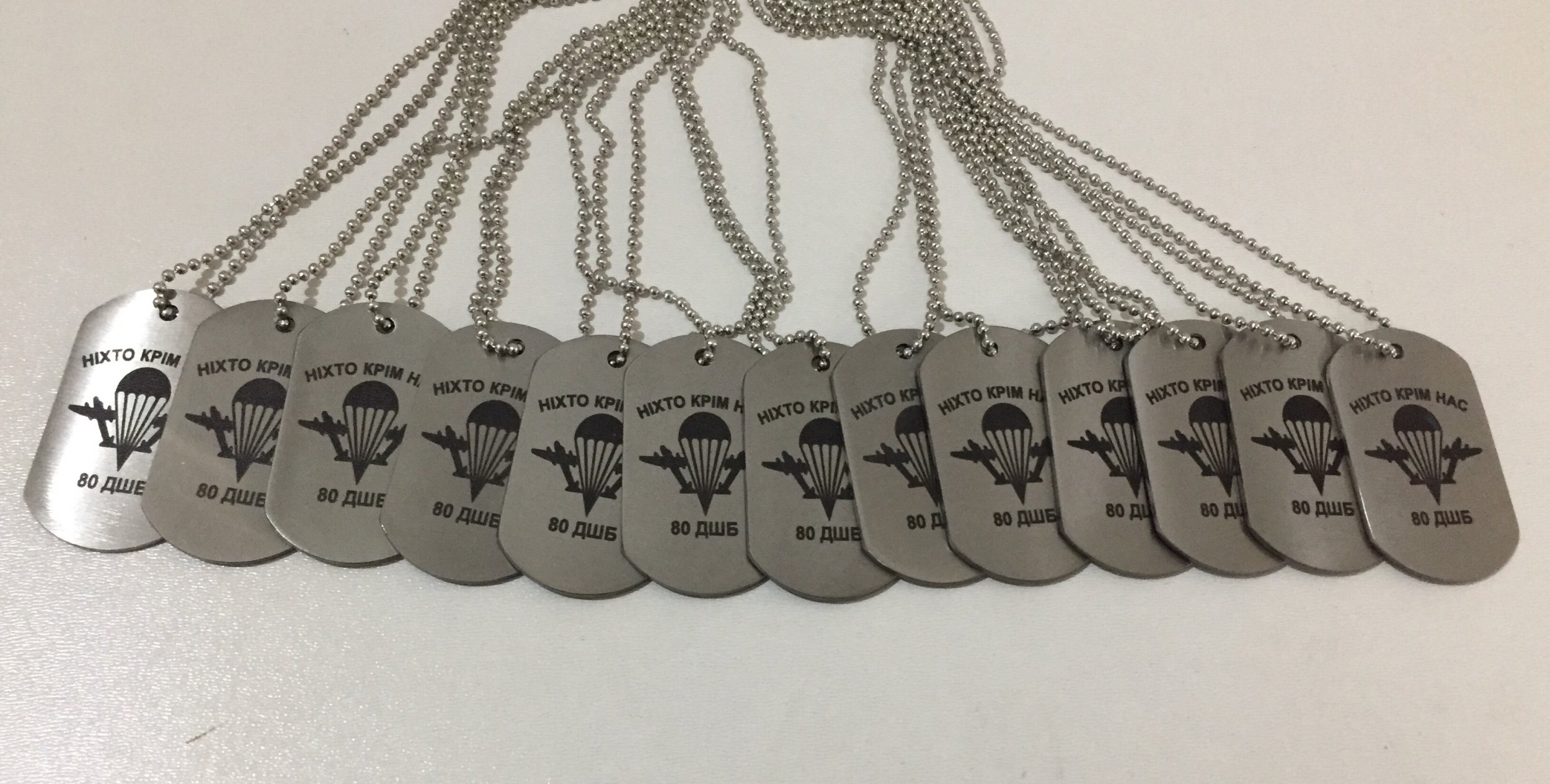 Слава Україні ! Жетони з гравіровкою. Жетон нержавійка,46*27*1.5 мм. Шарікова цепочка 2 мм.Довжина 70 см. Гравіровка з обох сторін(глибина відчутна ). Стророна А малюнок на вибір по номеру. Сторона Б ваші дані(на фото зразок). Відправка новою поштою, оплата на картку,після готовності. Ціна 150 грн.З повагою Віталій.