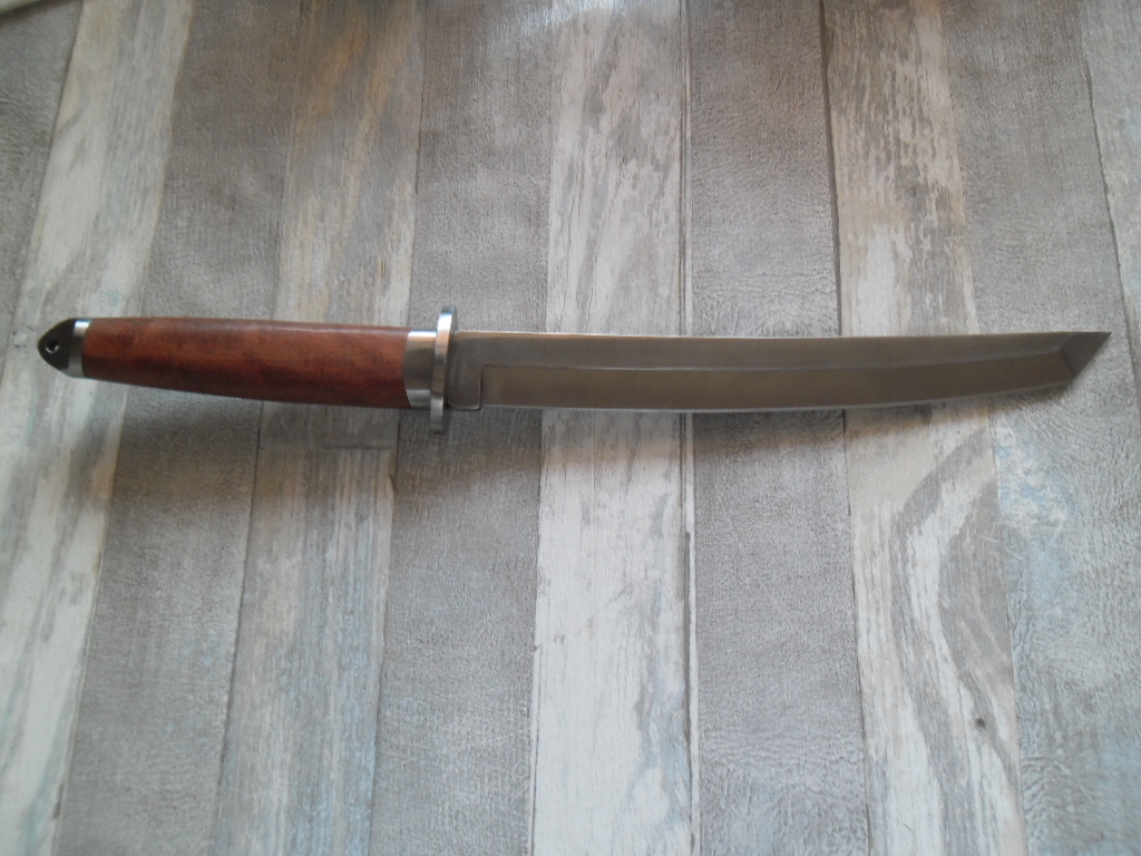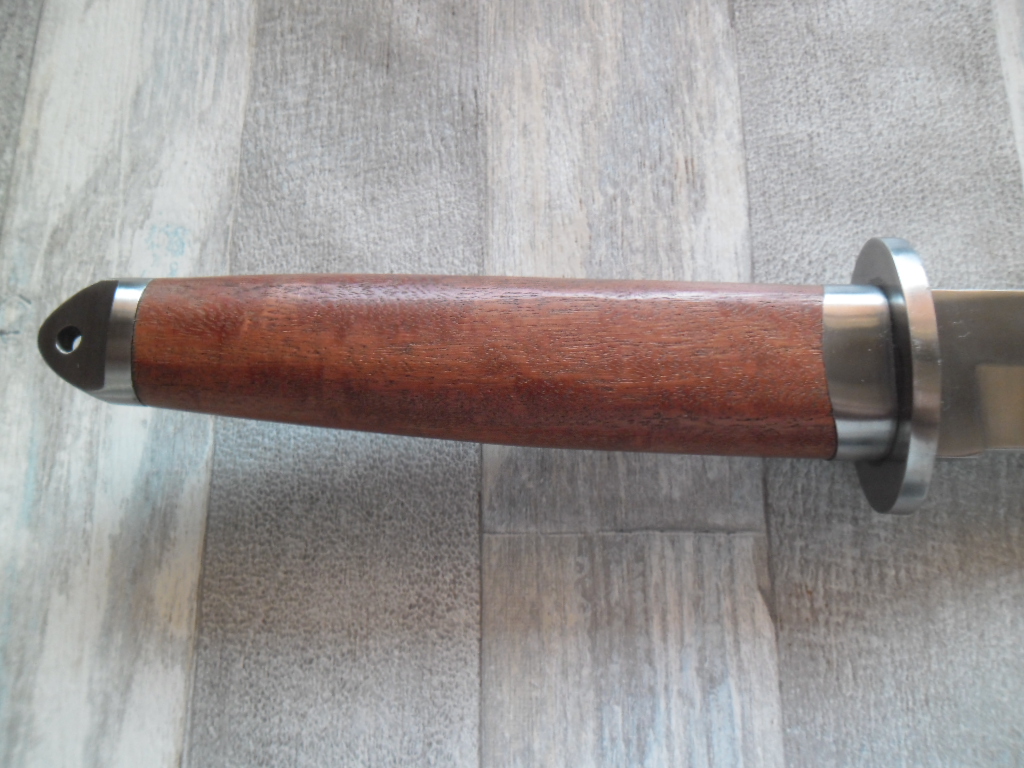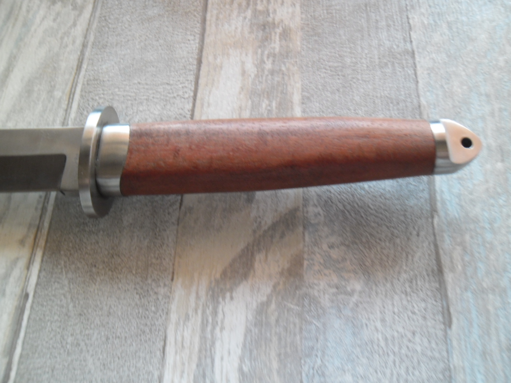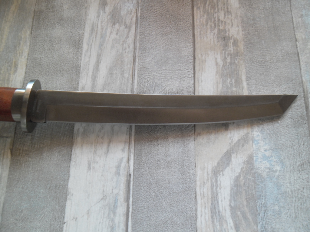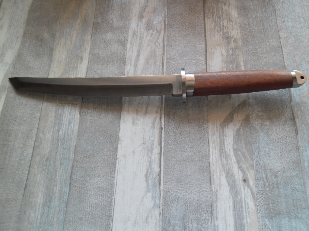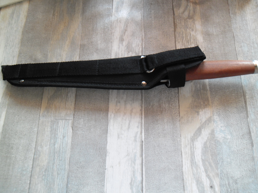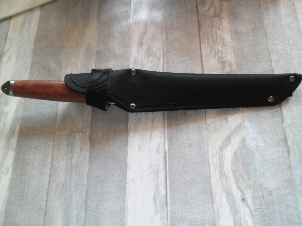 Общая длина: 365 мм Длина клинка: 225 мм Толщина клинка: 4,7 мм Сталь 420 (54 HRC) Рукоятка: дерево, металл Вес: 270 г Ножны: Нейлон Отверстие в рукояти под темляк Цена 600грн.