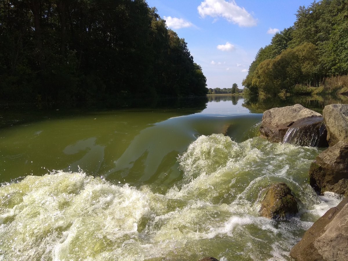 Катался на мотоцикле от Хмельника вверх по Южному Бугу. Красивые места, но по левый берег, начиная от дворца графа Ксидо, замусорен отдыхающими-рыбаками. Правый берег чище, живописный водопад на каменной насыпи, остановился в этом месте - красивый вид на возвышенности. 49°33'25.3"N 27°53'44.4"E