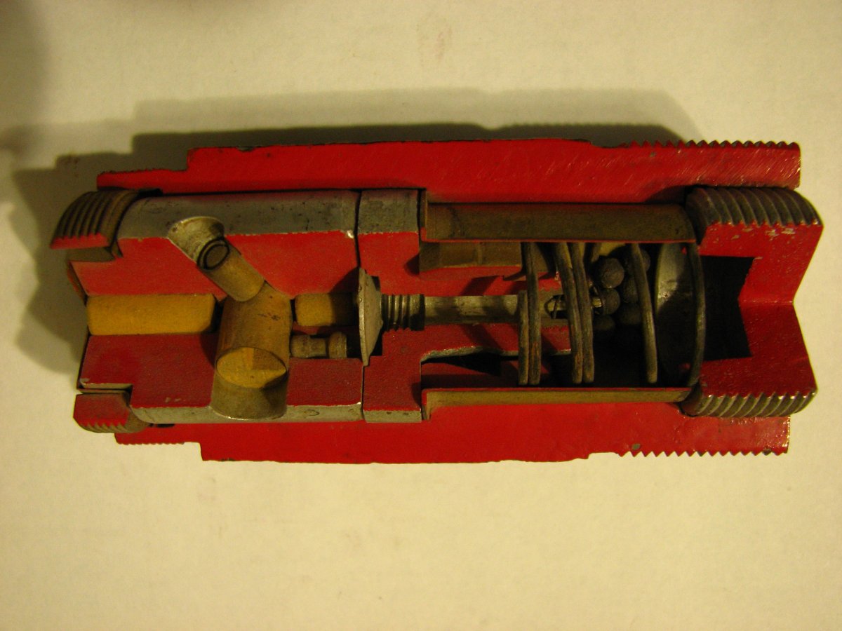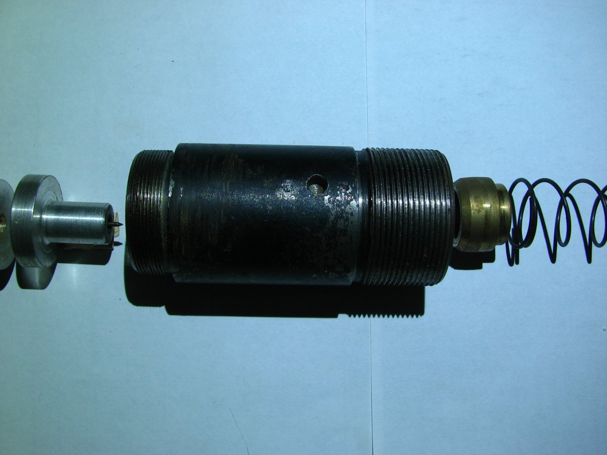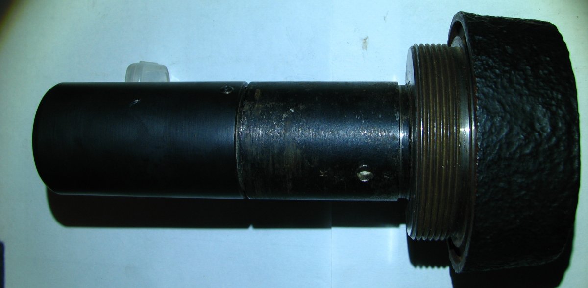 Приветствую всех. Это донный взрыватель от 105 мм венгерского фугасного снаряда. ОПАСЕН!!! Начинка (тетриловый промежуточный заряд в стакане) и КД присутствуют. Вот изделие детально и куда вкручивалось: Склеил как мог, вот отдельно части (малую пружину случайно не с той стороны положил ) Механизм в разрезе (отсутствует несколько деталей): Простите за фото, не получилось при дневном свете сделать. Кому надо, и так поймёт что и к чему. И для лучшего понимания - схема. Какая есть, дела давно минувших лет По вашим фото видно, что изделие имеет деформации, видимо с сапёрного подрыва, потому резьбы скорее всего заклинены.