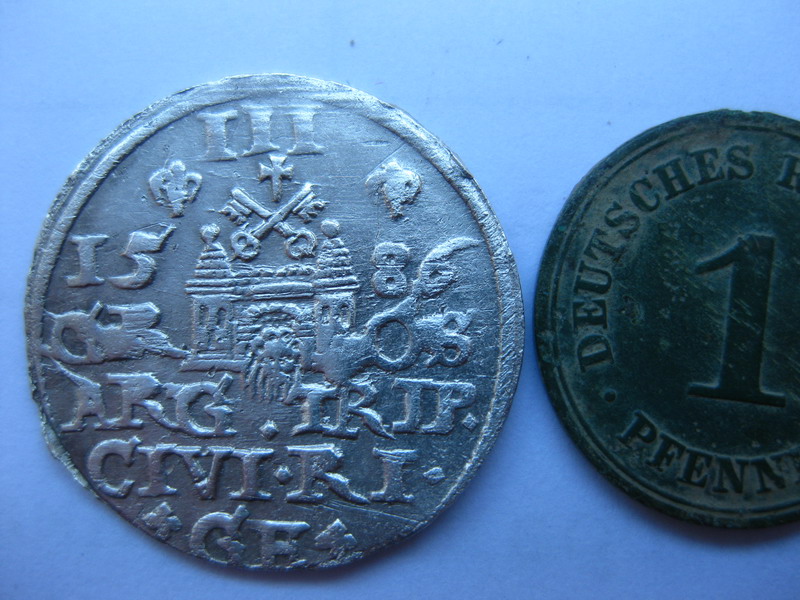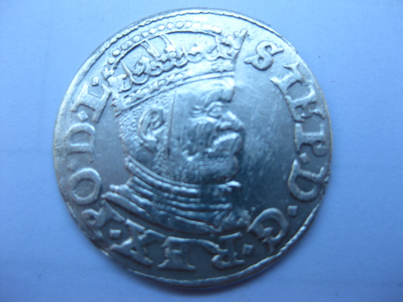 Трояк. 1582. Стефан Баторий. Аверс - портрет короля ("STEP D G REX POLO"). Реверс - номинал "III", дата, герб Риги "GROS / ARG TRIP / CIVI RI / GEN". Рига.