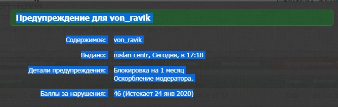 Прошу администрацию предоставить информацию, за что и на какой срок был забанен данный пользователь. Его профиль закрыт, так что нет информации. Причина интереса - им была создана тема по продаже складского мушковода на ВМ-КМ. Я был вторым, кто поставил в теме резерв. Человек мне в ЛС написал, что мушководов есть несколько и если мне нужно - можно оплачивать, и дал реквизиты на оплату. Деньги были в тот же вечер перечислены. Сутки на форум не заходил - был занят. Сегодня заглянул - в переписке тишина, продавец в бане, тема по продаже удалена. Вот и хочу для себя прояснить ситуацию: очередное кидалово и мои денежки тю-тю или всё же можно надеяться. Но настораживает отсутствие темы (особенно, если она была удалена самим продавцом, а не кем-то из модераторов). Если есть необходимость - подключу к переписке модератора. Если информация "не для всех" - прошу ответить в ЛС. Заранее - спасибо. PS: всё же плохо, что была закрыта тема "Бан" - можно было зайти и посмотреть, за что и на какой срок забанен пользователь. Предлагал также в случае бана открывать профили тех пользователей, которые их делают закрытыми, но ничего не изменилось. С уважением