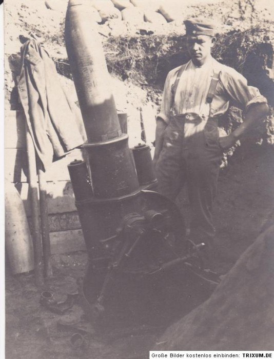 170-мм. Бомба ("мина") к 17cm mittlerer Minenwerfer (System Ehrhard). Скорее всего фугас. Но Если бы указали ТОЧНЫЕ размеры (а не прикладывая фискарь к находке) длины, пояска и запоясковой части, то можно было бы определить что это за зверь. "Просто" фугас али химия...