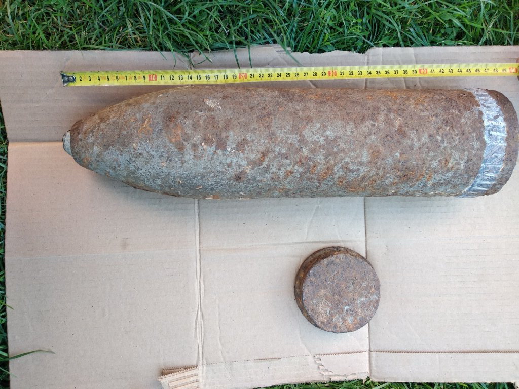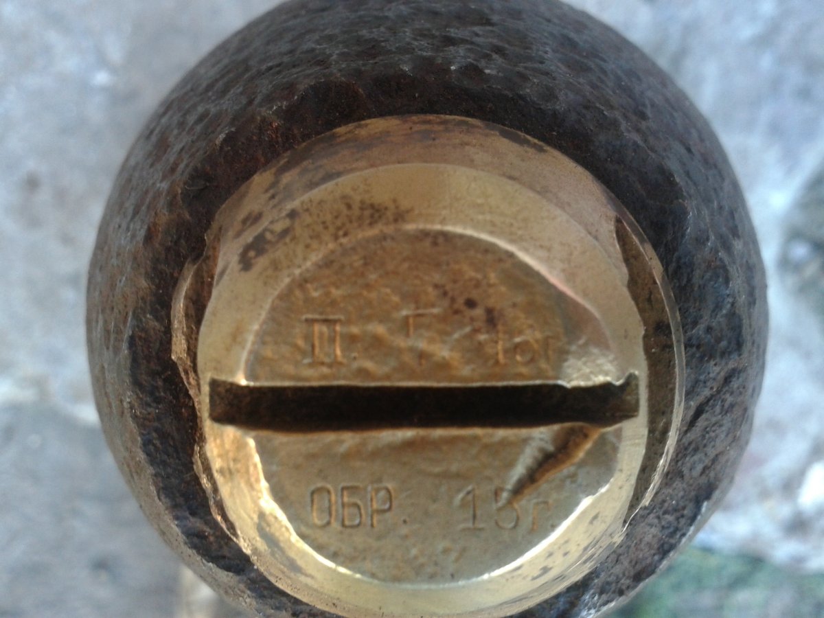 Точно "в діаметрі по дні ~ 80 ММ"???? Может все же 122-мм??? Видится 122-мм (48-линейный) снаряд РИА, фугасная бомба. В голове ВЗРЫВАТЕЛЬ хоть и "...має проріз як під викрутку" - упрощенная трубка Гронова обр. 1915 года.