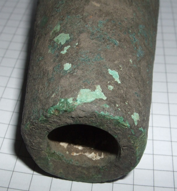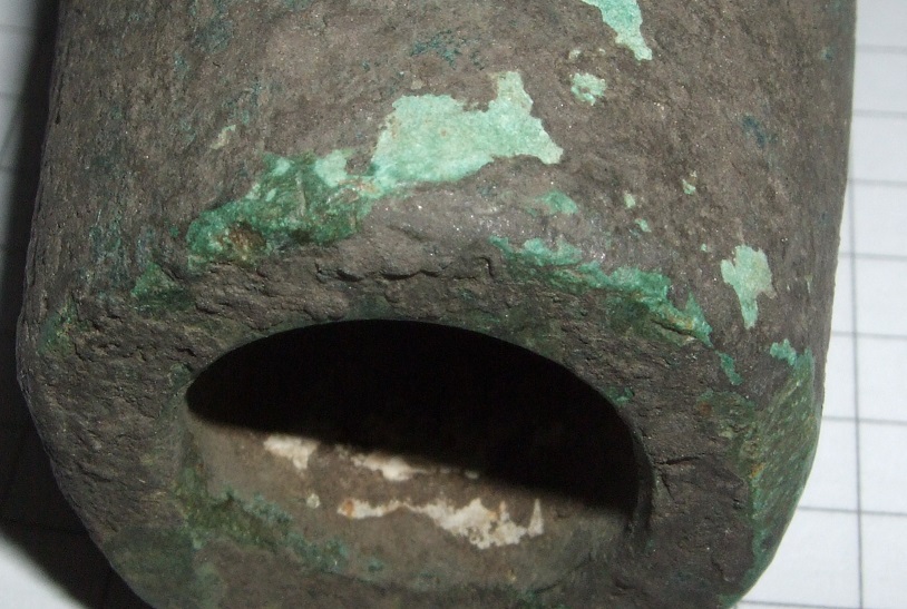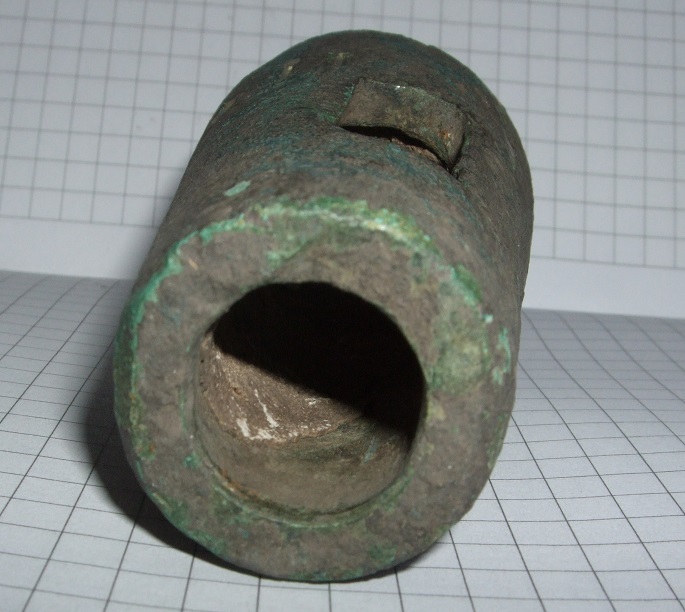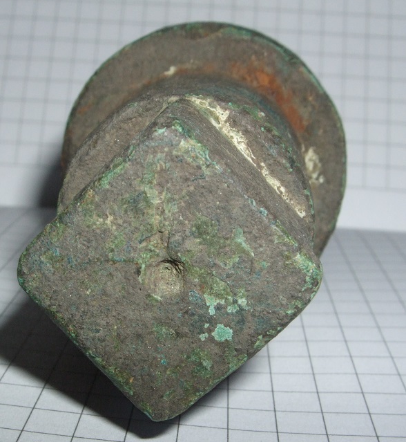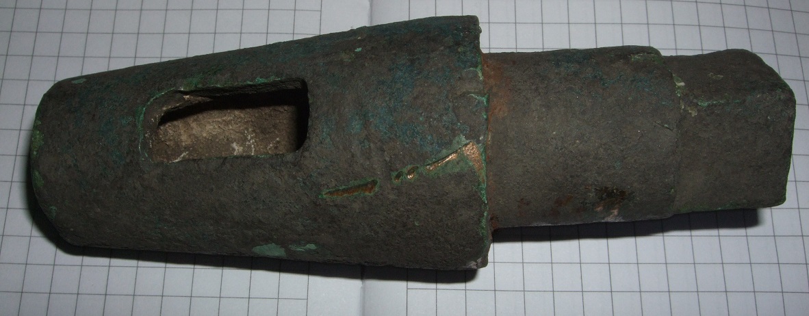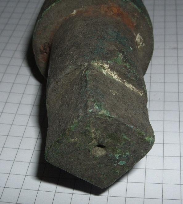 На этом же поле найдена и бронзовая часть от бочкового крана (как предполагаю) . Скифам вряд ли были доступны такие технологии . Но патина указывает на более менее длительное пребывание в земле. Размеры-длинна -114 мм, максим диаметр клина-39 мм, квадрат около 20 на 20 мм. Может кто сталкивался от чего бы это могло быть. С ув.